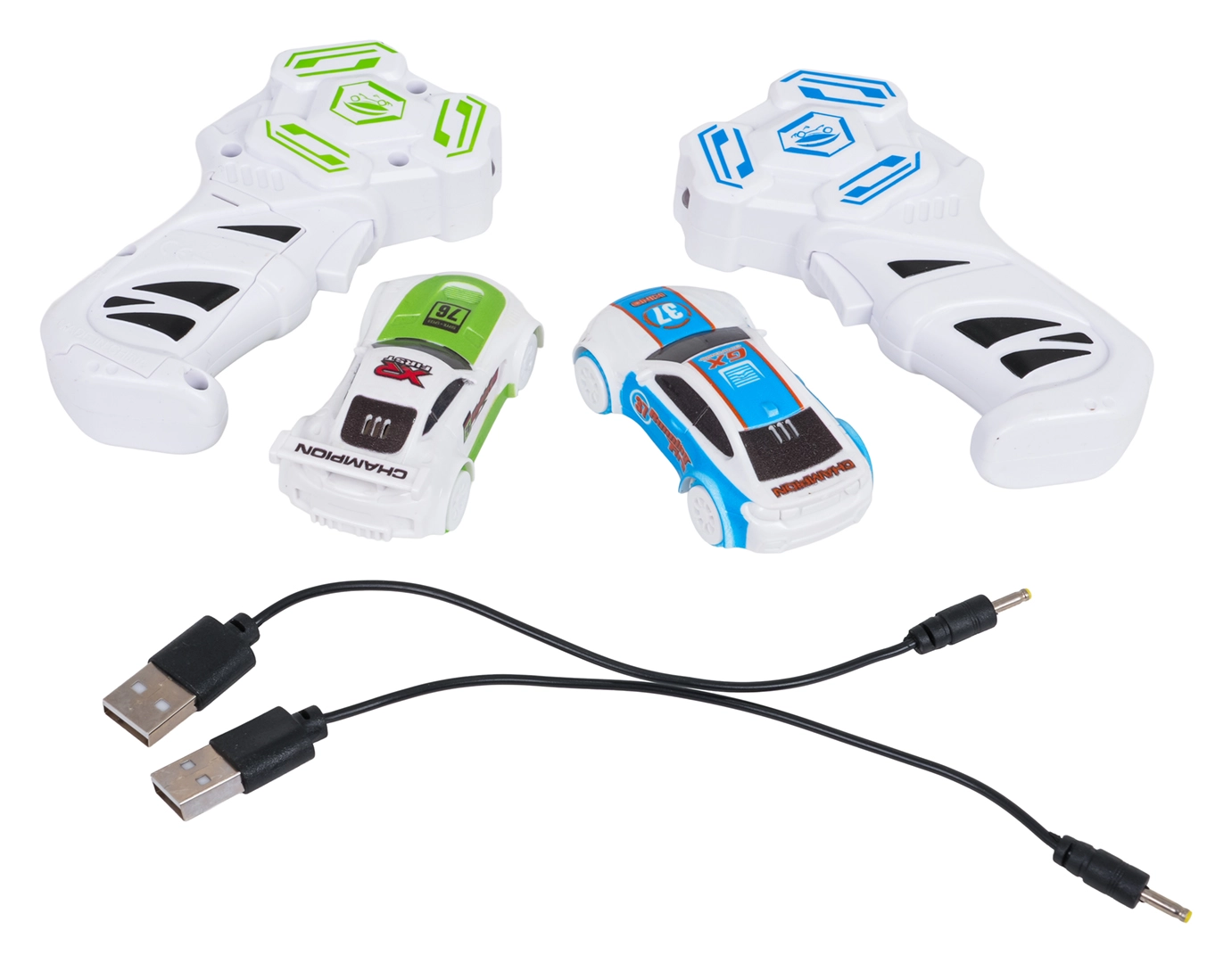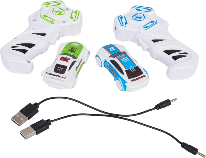 - 2 × samochodzik, 2 × pilot zdalnego sterowania, 2 × kabel USB do ładowania, elementy toru, instrukcja