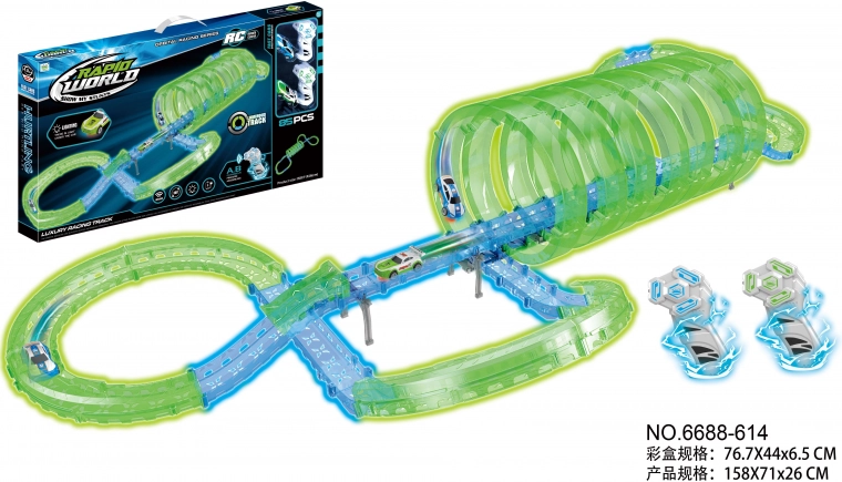 Duży tor wyścigowy dla dzieci od 6 lat zapewnia pełną akcji zabawę z dwoma autkami na zdalne sterowanie. Tor jest fluorescencyjny i świeci w ciemności, a autka mają podświetlenie LED, tworząc efektowne efekty świetlne. Dzięki pętlom 360° i łatwemu montażowi rozwija koordynację, wyobraźnię oraz małą motorykę dzieci.