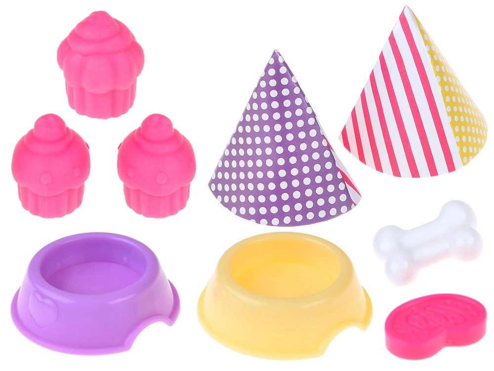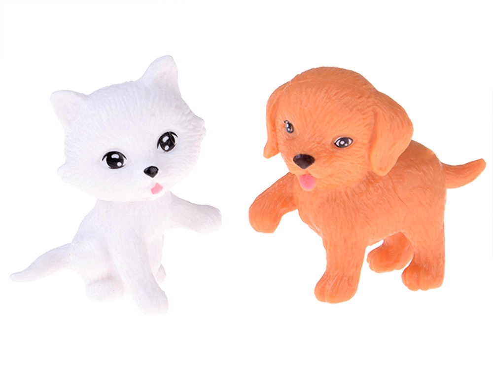 Biała kotka i brązowy piesek z własnymi miskami, przysmakami i kostką dodają każdej scenie uroku i uczą dzieci opieki oraz dzielenia się.