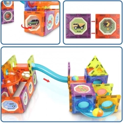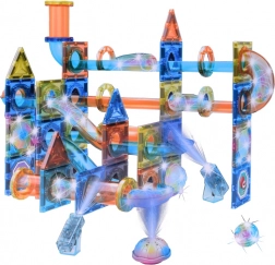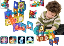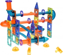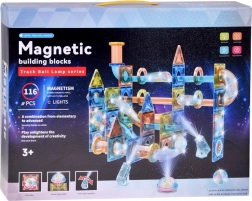 Ten duży magnetyczny zestaw łączy przezroczyste panele, rurki i wygięte elementy do tworzenia płynnych torów, po których kule toczą się z piętra na piętro. Mocne magnetyczne złącza trzymają stabilnie, dzięki czemu dzieci mogą bez obaw testować nowe warianty i ulepszać swoje konstrukcje. Świecące kulki, reflektory i kopułkowe światełka rozjaśniają tor i zmieniają zabawę w magiczne świetlne widowisko.