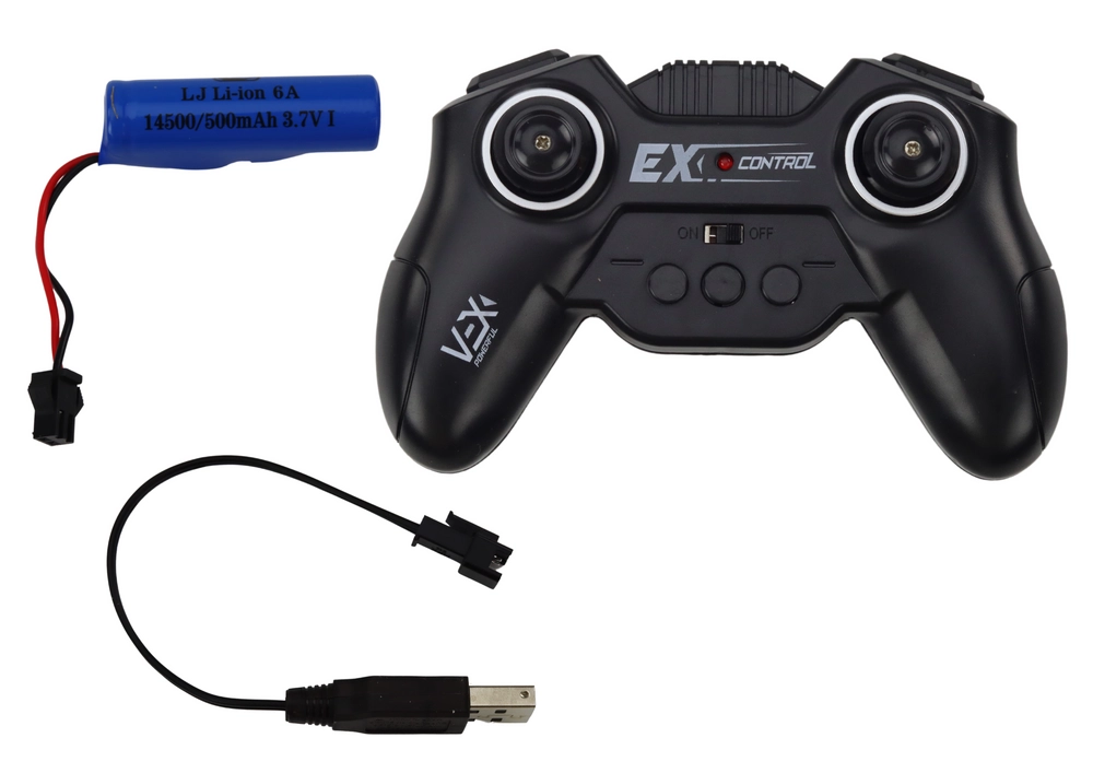 W zestawie znajdziesz kontroler, akumulator Li‑ion 3,7 V, kabel USB do ładowania. Wystarczy włożyć baterie do kontrolera i ruszać w drogę.