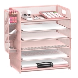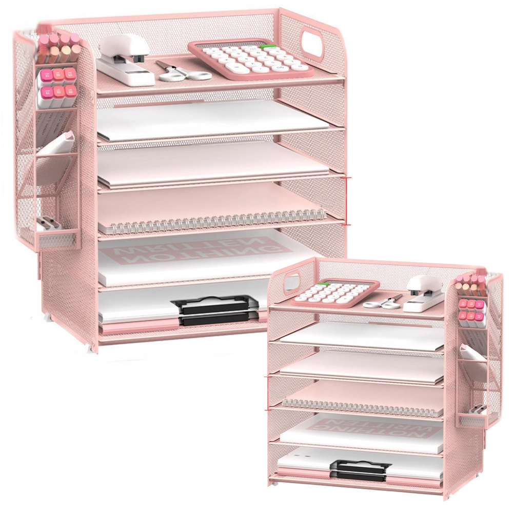Stylowy metalowy organizer na biurko w różowym kolorze utrzyma Twoje stanowisko pracy przejrzyste i eleganckie. Oferuje 5 przestronnych przegródek na akcesoria biurowe, wykonany z lakierowanego metalu o siatkowej konstrukcji dla trwałości i stabilności. Dzięki kompaktowym wymiarom zmieści się na każdym biurku i wprowadzi do wnętrza porządek oraz nowoczesny design.