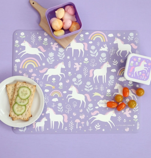 Hojne wymiary zapewniają wystarczająco dużo miejsca na talerz, sztućce i szklankę. Pastelowy fiolet z motywem jednorożców i tęczy rozświetli dziecięcy stół i podkreśli radosną atmosferę przy jedzeniu.