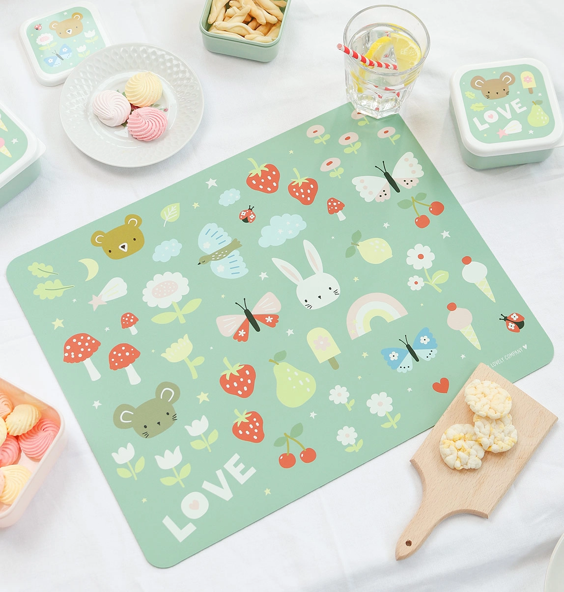 Praktyczna dziecięca podkładka w intensywnie zielonym kolorze z figlarnym motywem pasuje do każdego stołu. Dzięki wytrzymałemu winylowi łatwo się czyści, długo świetnie wygląda i chroni powierzchnię stołu podczas codziennego użytkowania.