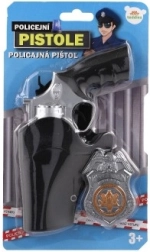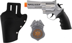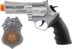 Zestaw policyjny dla dzieci zawiera realistycznie wyglądający plastikowy rewolwer, odnoszący się do świata ochrony prawa i porządku, uzupełniony o odznakę i kaburę dla pełnego doświadczenia gry.