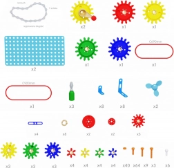 Zestaw zawiera dziesiątki kół zębatych, kół pasowych, pasków napędowych, łańcuch, śruby, nakrętki, uchwyty oraz ręczne śrubokręty. Jest idealny do edukacji STEM, rozwoju rozwiązywania problemów i współpracy w zespole. Dzieci mogą konstruować urządzenia eksperymentalne, wentylatory, układy przekładniowe lub proste maszyny i natychmiast obserwować rezultaty.