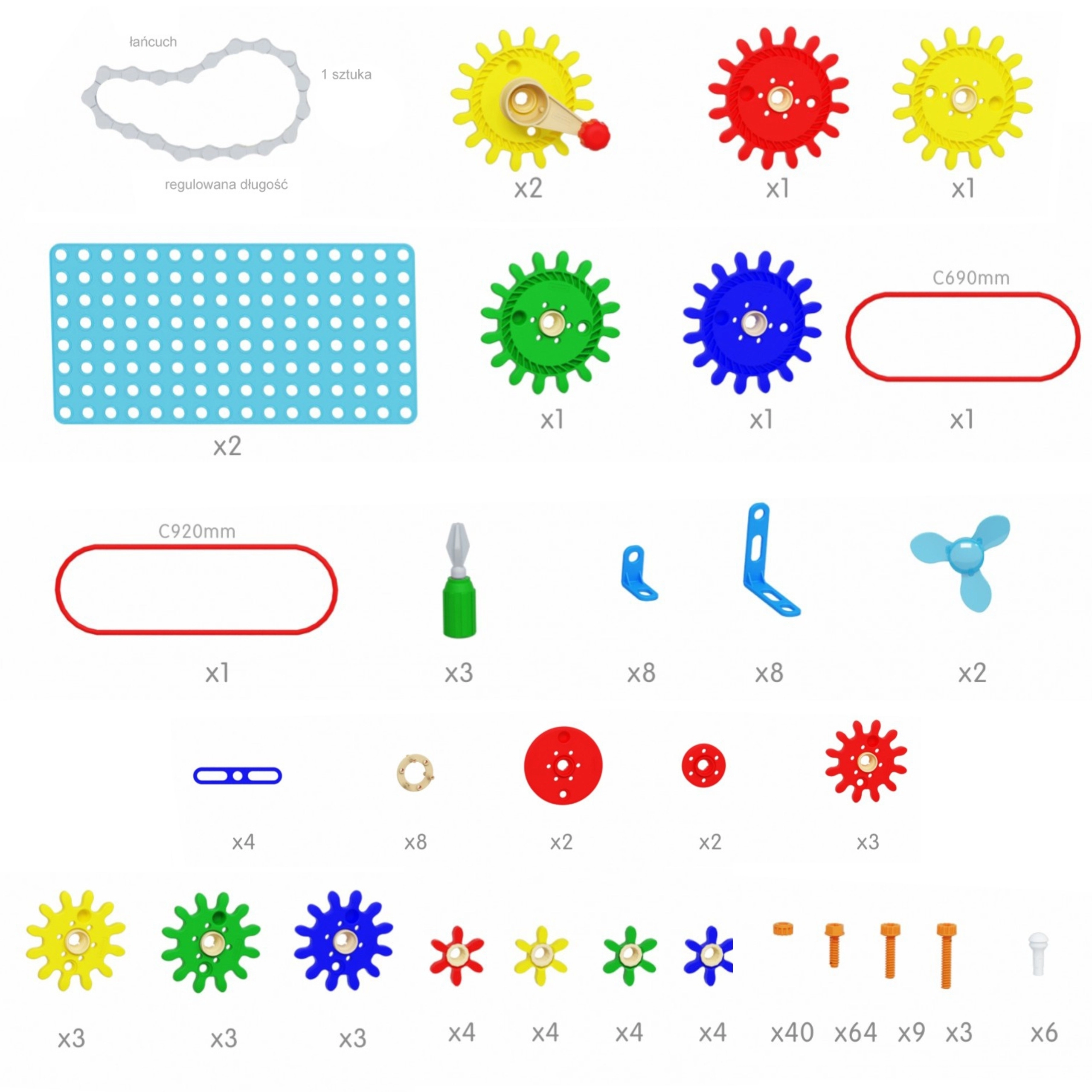 Kolorowe koła zębate, koła pasowe, paski napędowe, łańcuch oraz ręczne śrubokręty wspierają praktyczne zrozumienie przenoszenia ruchu i konstrukcji mechanizmów.