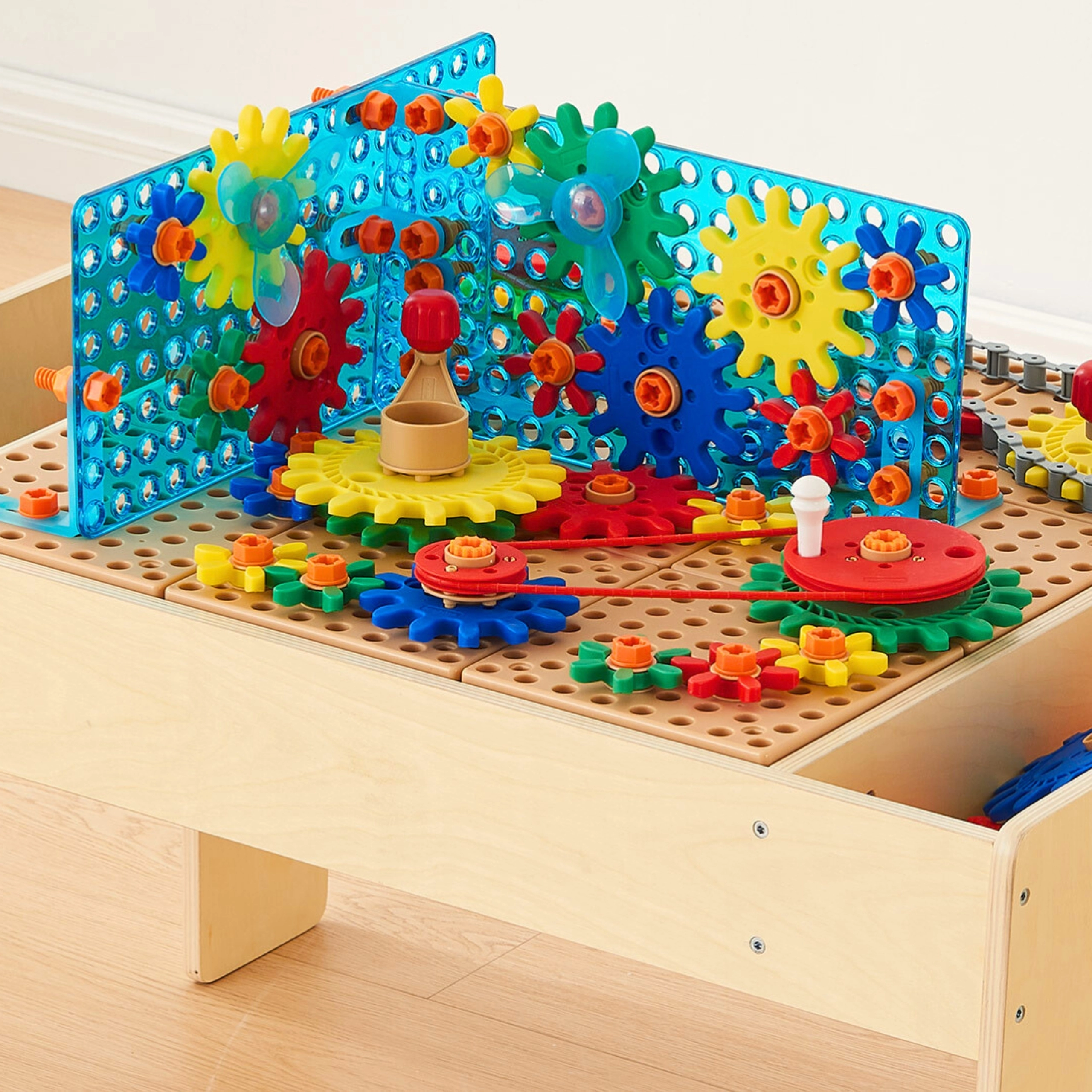 Przegrody po bokach utrzymują śruby, nakrętki i przekładnie w przejrzystym porządku, aby dzieci mogły skupić się na tworzeniu.