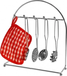 - Patelnia; 3 garnki różnej wielkości; 2 pokrywki; 2 kubki; stojak na akcesoria kuchenne; tekstylny podkład pod naczynia; tekstylna rękawica; 4 łyżeczki; trzepaczka; chochla; łopatka; cedzak; łyżka do makaronu; 2 płaskie sitka