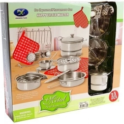 Kompletny nierdzewny zestaw kuchenny dla dzieci z 23 elementami zapewnia godziny kreatywnej zabawy i nauki. Zawiera patelnię, garnki z pokrywkami, akcesoria oraz tekstylia – wszystko w metalicznym wykończeniu, które pasuje do każdej dziecięcej kuchni. Wspiera małą motorykę, współpracę i rozwój kreatywności. Odpowiedni od 3 lat, z certyfikatem CE i zgodny z normą EN 71.