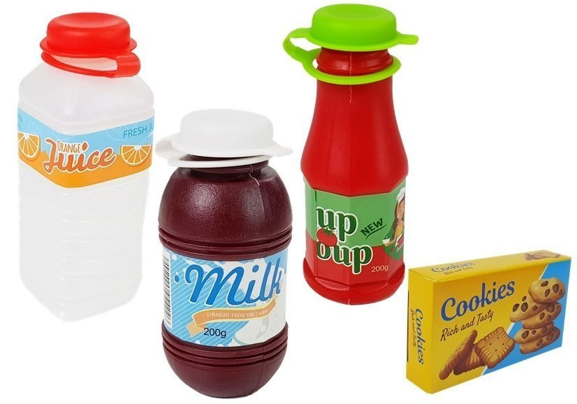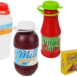 Zestaw produktów spożywczych, takich jak mleko, sok, ketchup i ciasteczka, urozmaici zabawę i pozwoli dzieciom tworzyć różne scenariusze zakupowe.