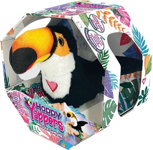 Uroczy interaktywny tukan Happy Yappers dostarcza dzieciom mnóstwo zabawy i bodźców. Reaguje na dźwięk i dotyk, macha skrzydłami, wydaje ptasie odgłosy i powtarza słowa. Dzięki samozaciskającej bransoletce dziecko łatwo przypnie go do ręki lub plecaka. Miękki bezpieczny plusz, ładowanie USB bez konieczności wymiany baterii oraz funkcja automatycznego wyłączania czynią z niego idealnego towarzysza dla małych odkrywców.