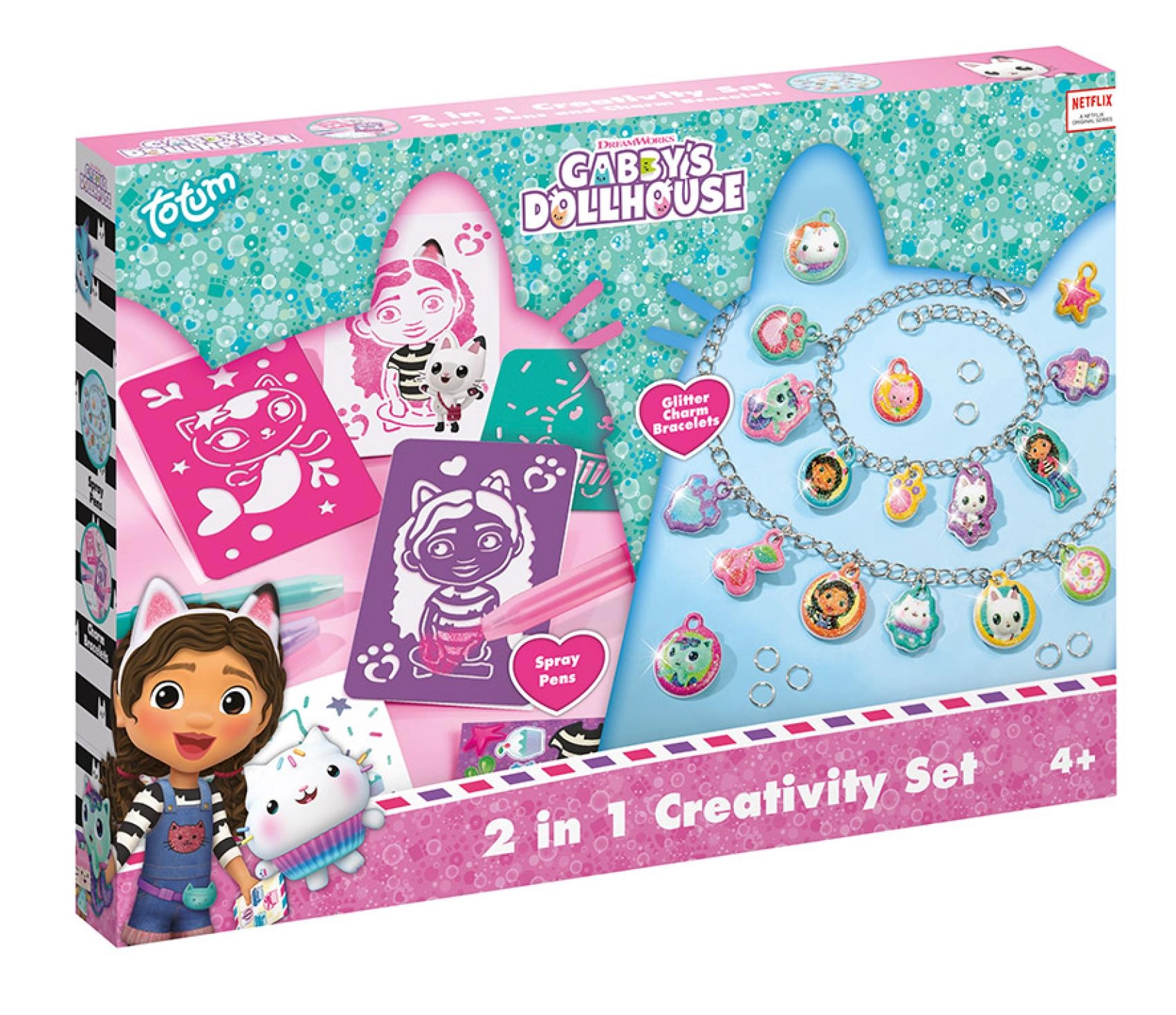 Odkryj zabawny kreatywny zestaw 2w1, dzięki któremu dzieci stworzą własne obrazki za pomocą dmuchanych flamastrów, a dodatkowo wykonają stylowe bransoletki z zawieszkami z motywami GABBY'S DOLLHOUSE. Zestaw rozwija kreatywność, motorykę małą i wyobraźnię – idealny prezent dla małych twórców od 4 lat.