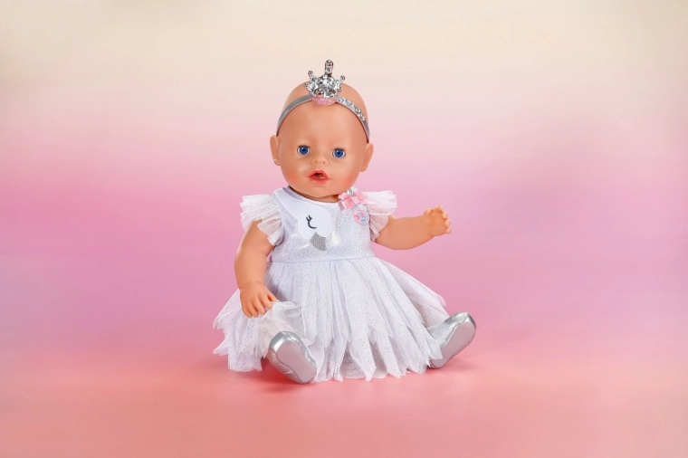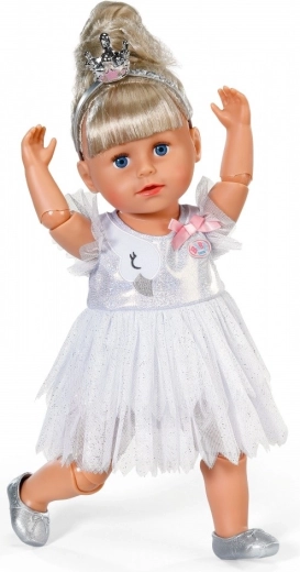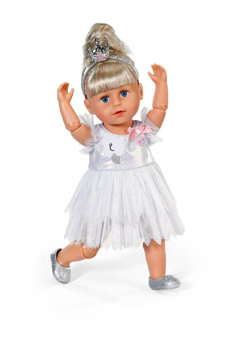 Rozświetl każde taneczne wystąpienie zestawem baletowym BABY born dla lalek 43 cm. Zawiera błyszczącą białą sukienkę tutu z motywem łabędzia i kokardką, srebrne baletki oraz koronę dla doskonale magicznego wyglądu. Świetny dodatek do kreatywnej i długotrwałej zabawy, kompatybilny także z BABY born Teddy.