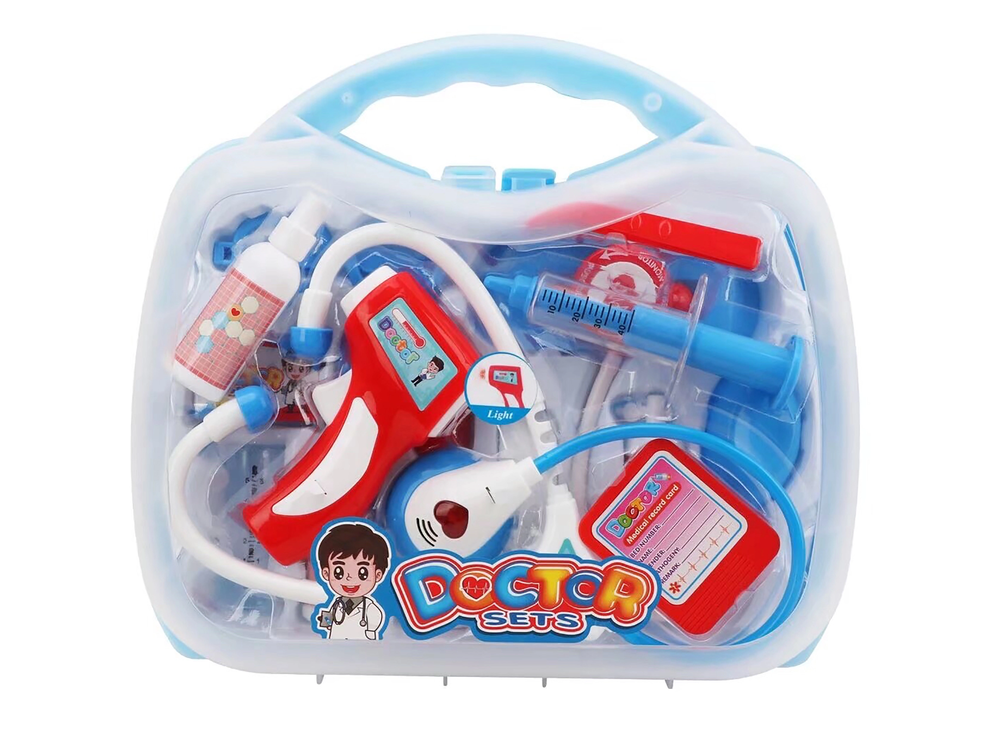 Zabawny i bezpieczny lekarski kuferek dla dzieci o wielkości 30 cm zawiera wszystko, co potrzebne do zabawy w lekarza: stetoskop, termometr, strzykawkę, pęsetę oraz inne akcesoria. W zestawie znajdują się efekty świetlne oraz baterie 4× AG10 dla natychmiastowej zabawy.