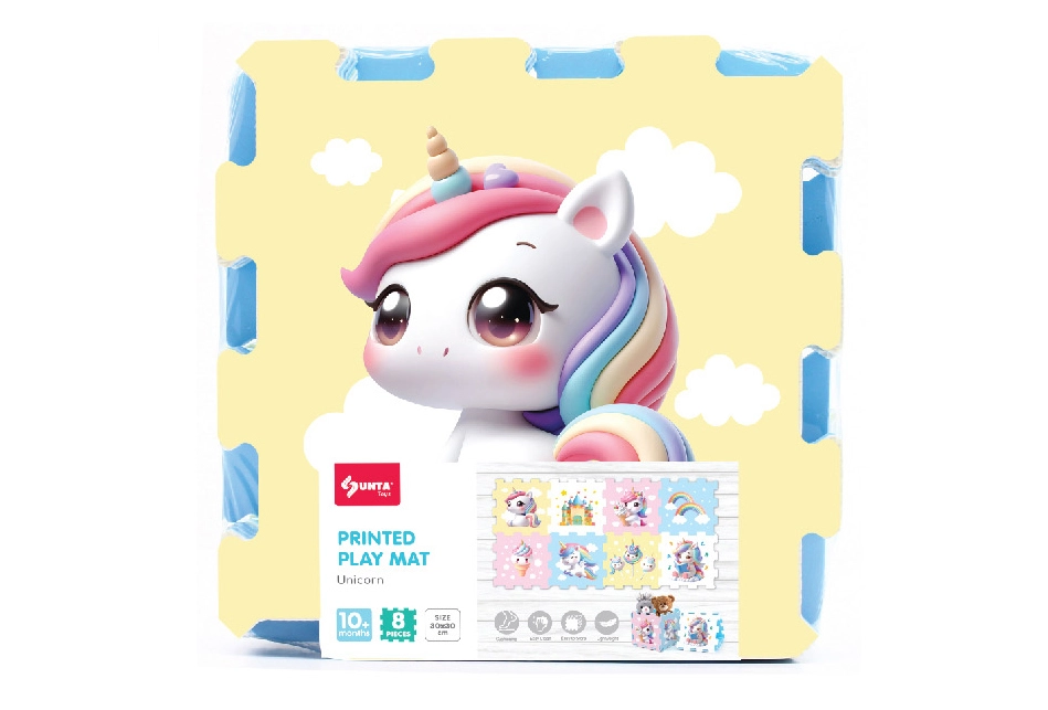 Rozwesel pokój dziecka zestawem miękkich piankowych klocków z motywem jednorożca. Zestaw 8 sztuk o wymiarach 30 × 30 × 1 cm jest idealny do zabawy, układania oraz jako mata. Lekkie, miękkie i łatwe w czyszczeniu elementy chronią przed chłodem i tłumią wstrząsy.