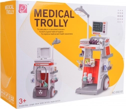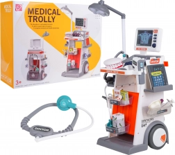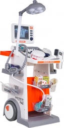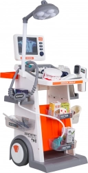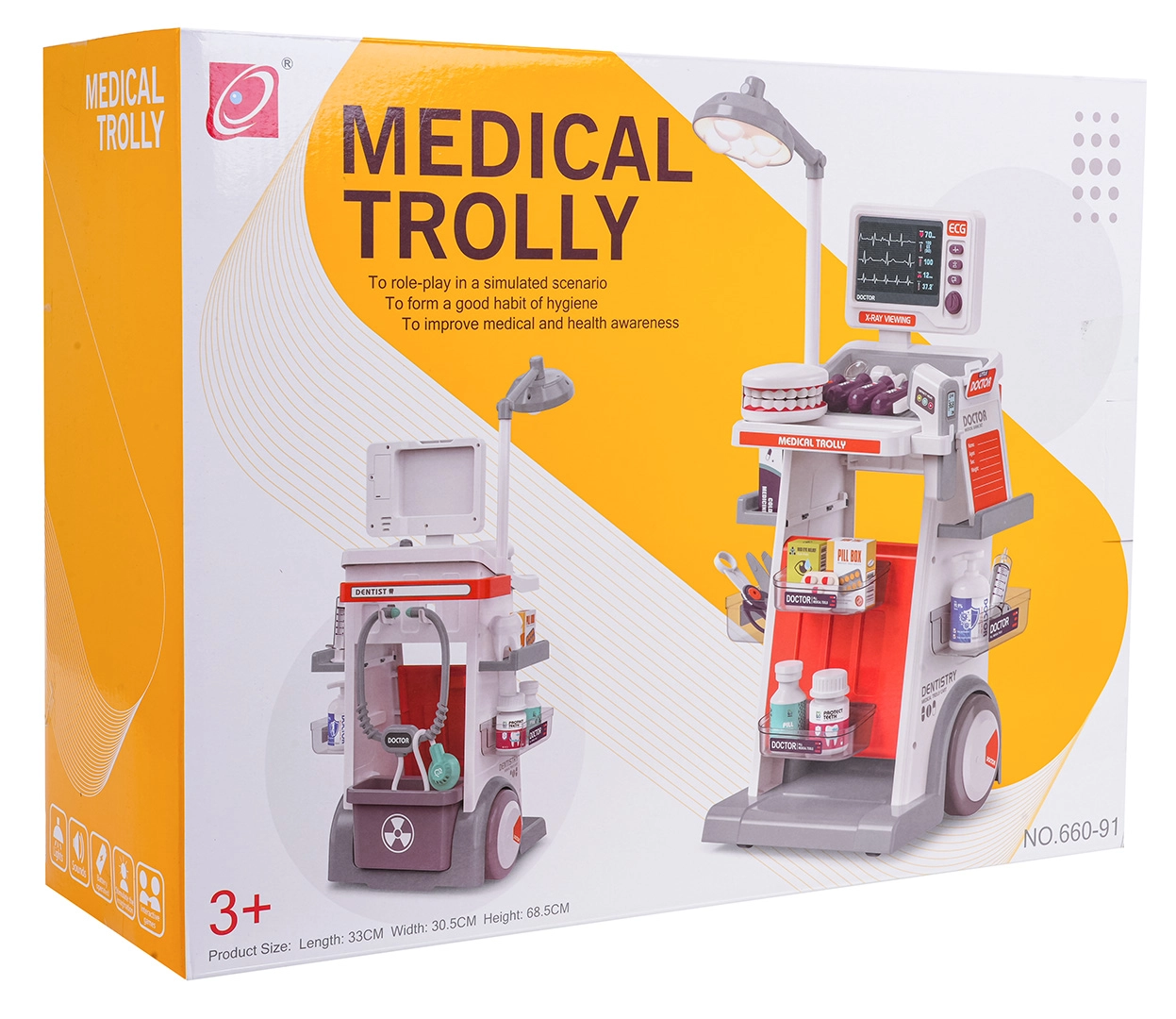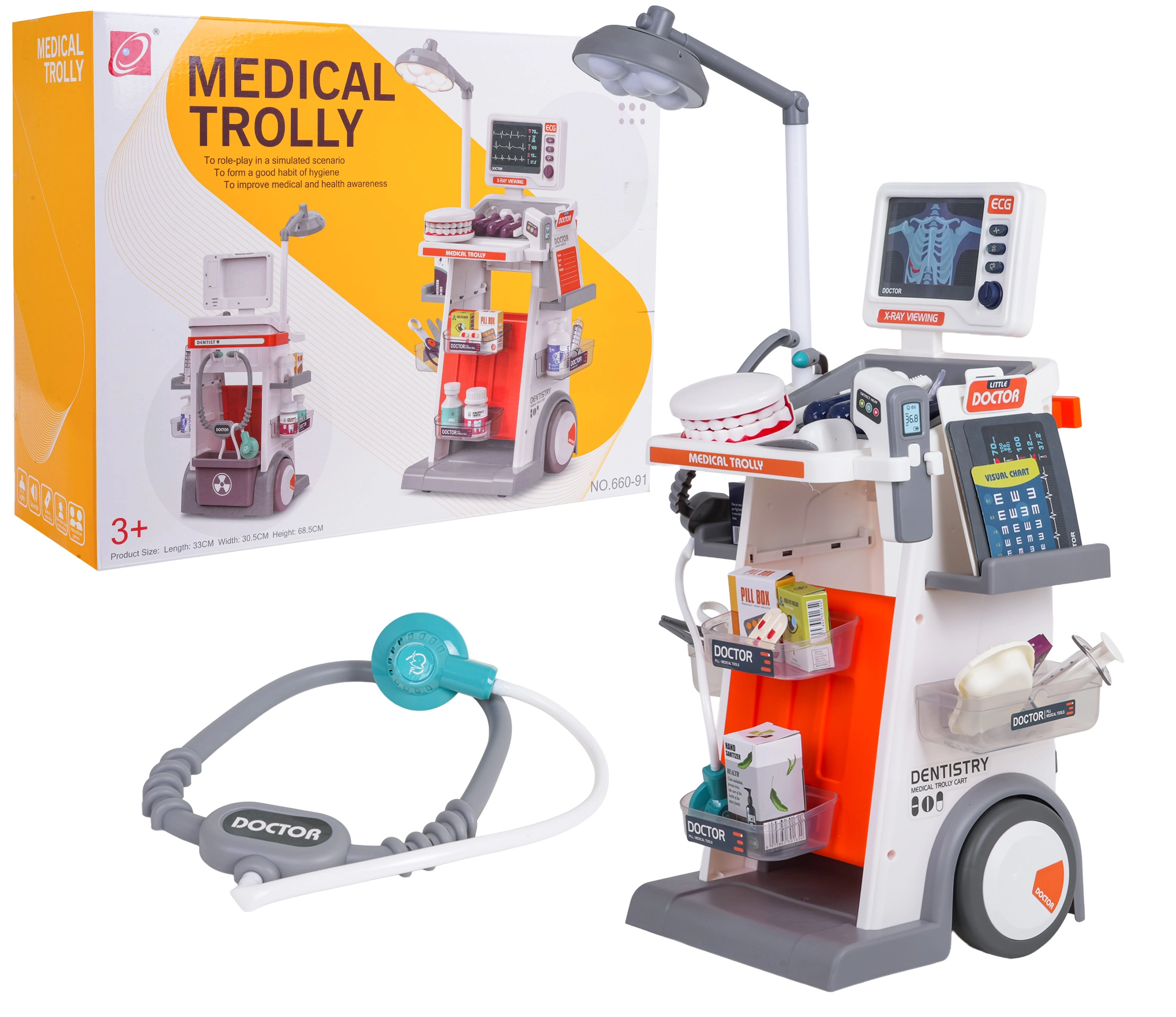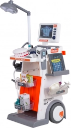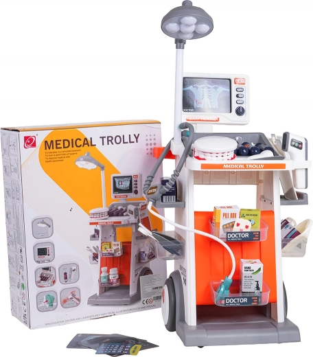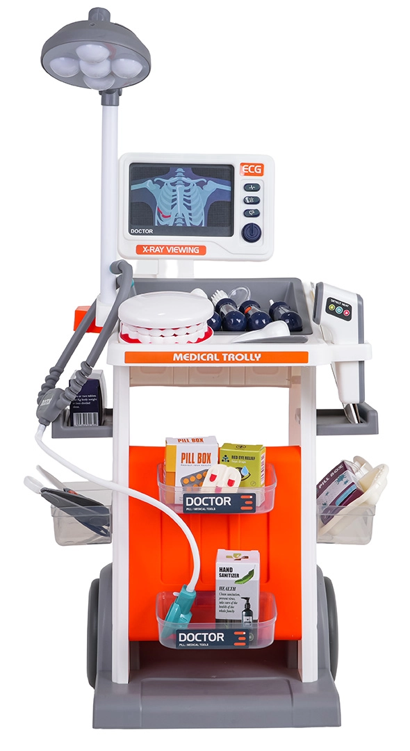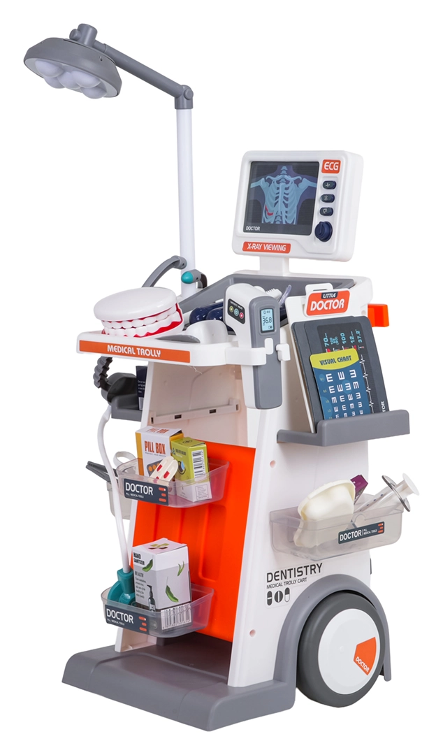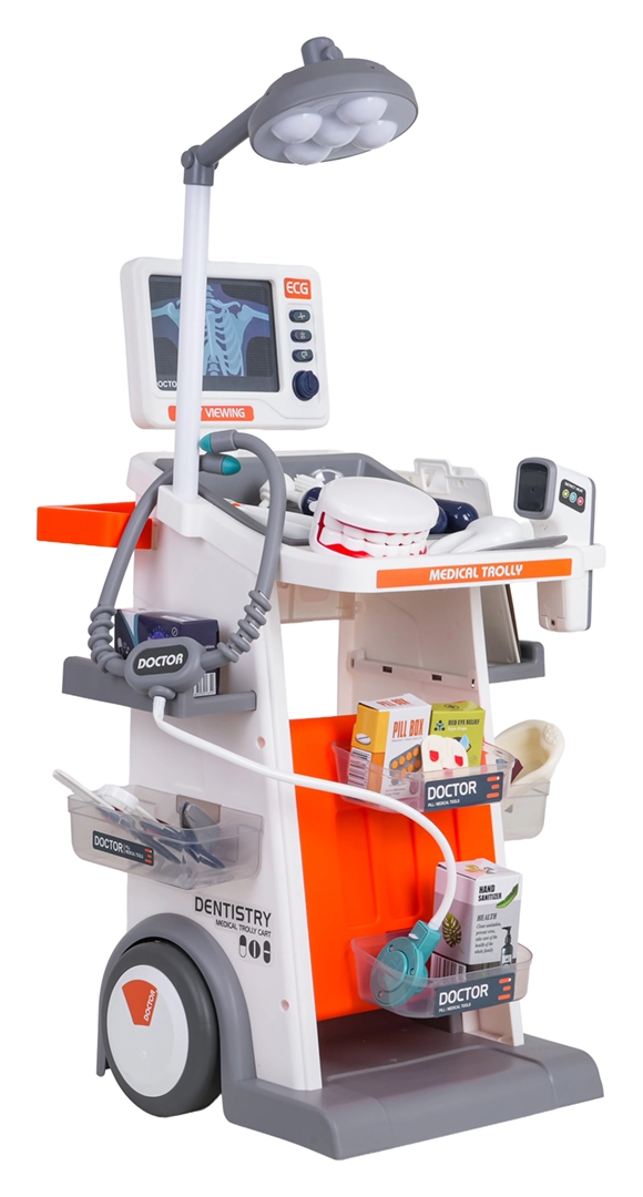 Ten bogato wyposażony zestaw łączy akcesoria lekarskie, dentystyczne i okulistyczne w jednym mobilnym wózku. Duże koła i uchwyt ułatwiają przemieszczanie, a półki i pojemniki mieszczą wszystkie dodatki. Dzieci pokochają realistyczną zabawę dzięki efektom świetlnym i dźwiękowym – lampie, panelowi z podglądem „RTG”, podświetlanemu termometrowi i dentystycznemu lusterku oraz dźwiękowi bicia serca w stetoskopie.
