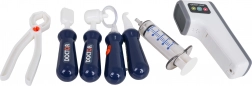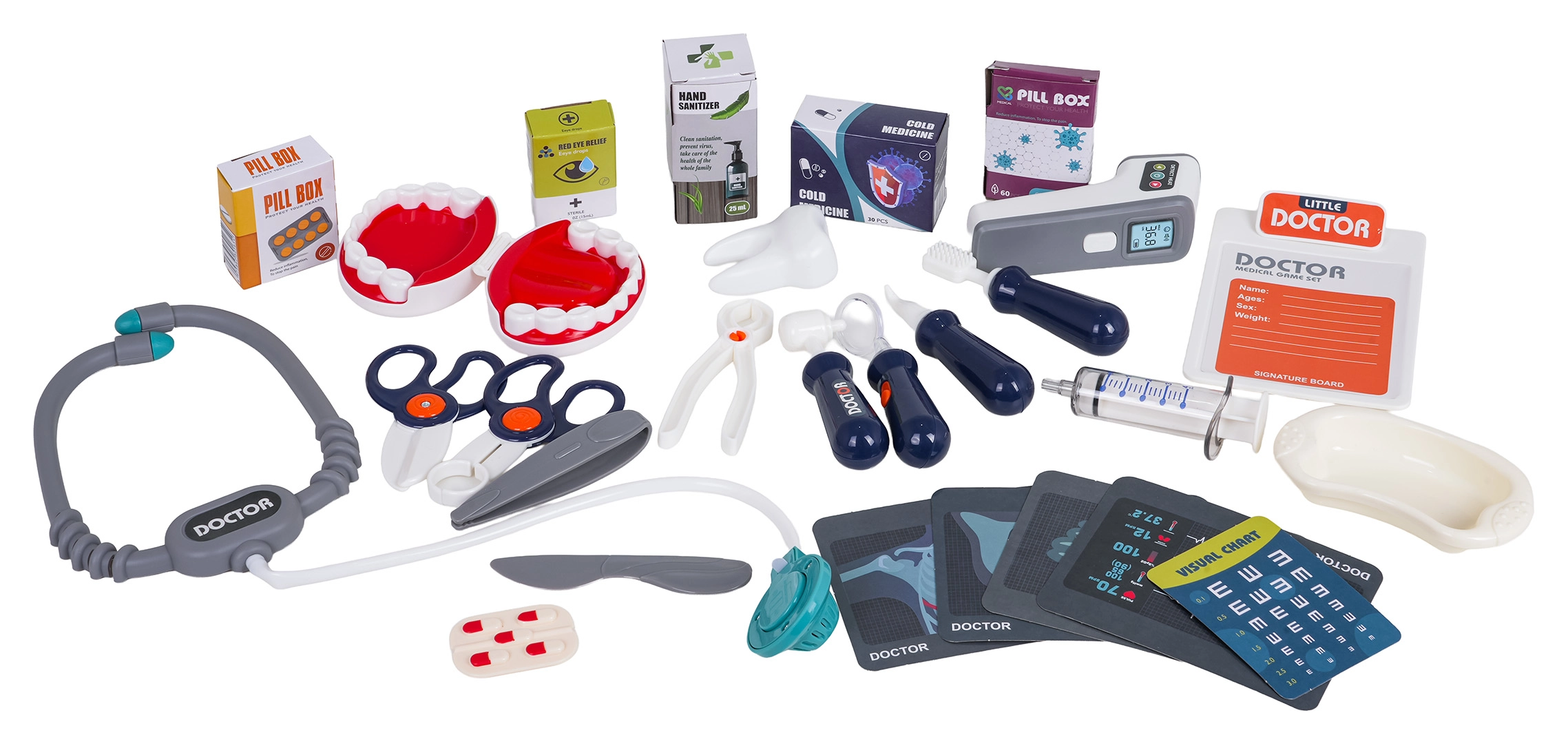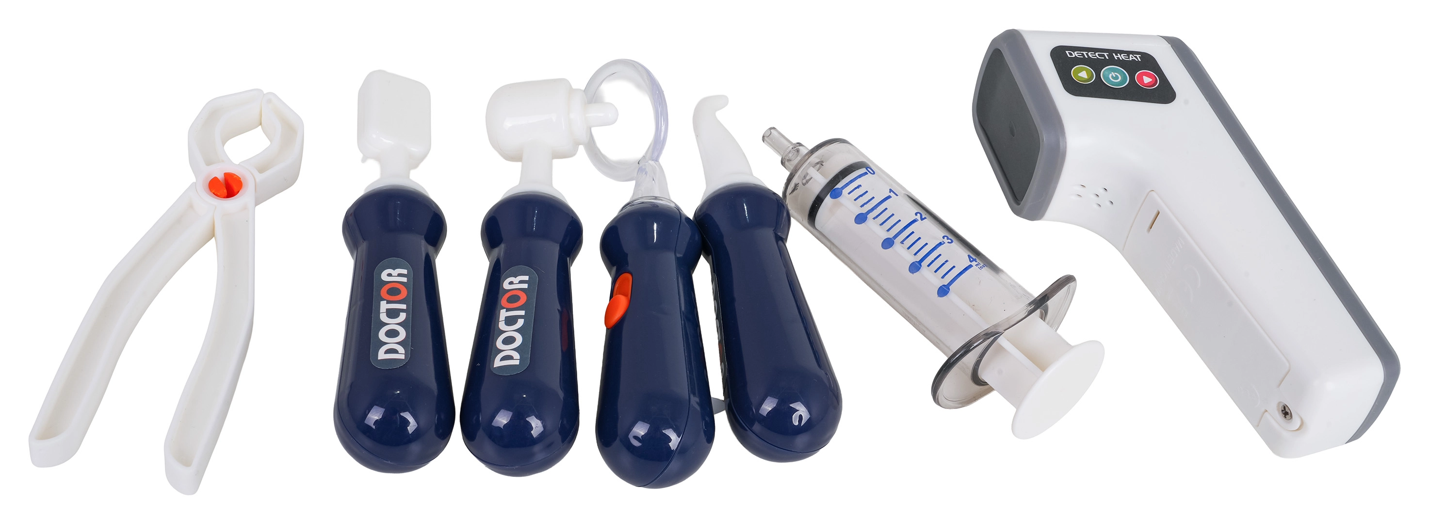Stetoskop, termometr, strzykawka, pęseta, nożyczki, narzędzia dentystyczne, „rentgenowe” karty, model zębów, karta pacjenta i inne akcesoria.