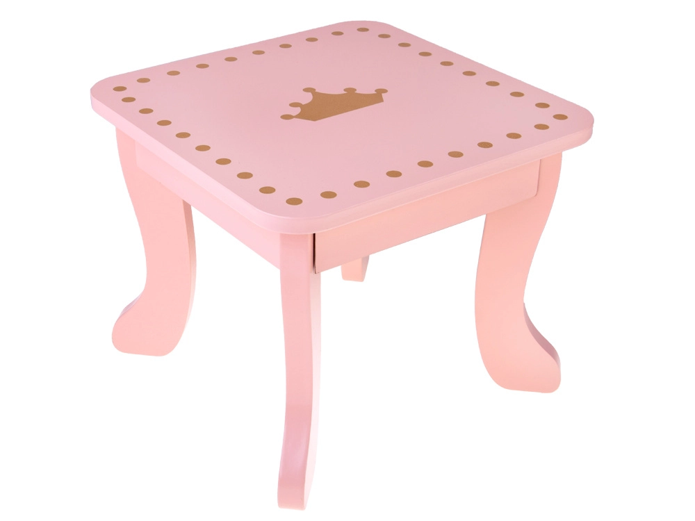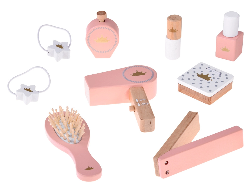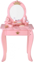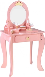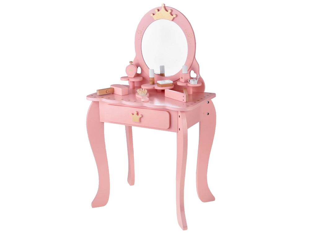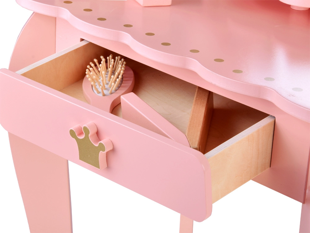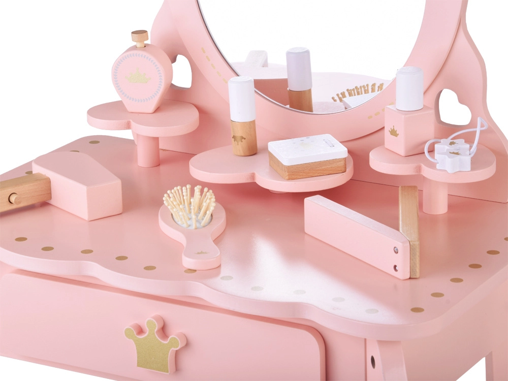 W zestawie znajduje się również wygodny stołeczek oraz liczne drewniane i plastikowe dodatki: szczotka, suszarka, prostownica do włosów, gumki, pomadka, cienie do oczu, perfumy, lakier do paznokci oraz trzy kubeczki w kształcie serca na drobiazgi. Subtelne połączenie różu, złota i srebrnych detali pięknie komponuje się z wystrojem pokoju dziecięcego.
