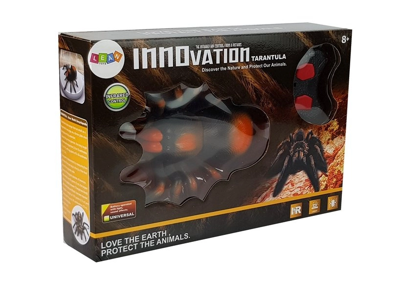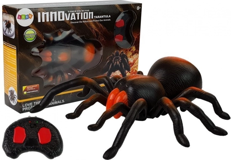 Olbrzymia czarno‑pomarańczowa tarantula wygląda na pierwszy rzut oka jak żywa. Wykonana z wysokiej jakości plastiku, ma detaliczne faktury, świecące oczy i płynny ruch nóg. Na pilocie na podczerwień znajdziesz dwa duże przyciski: jeden do płynnego ruchu do przodu i drugi do szybkiego obrotu w prawo. Idealna do zabawy w domu, na przyjęciach oraz jako straszna dekoracja.