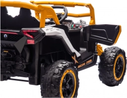 Solidny dziecięcy samochód elektryczny 4x4 w atrakcyjnym żółtym kolorze dla dwojga dzieci oferuje przygodową jazdę w terenie, duże profilowane koła, realistyczne światła oraz wytrzymałą konstrukcję dla bezpiecznej zabawy na świeżym powietrzu.