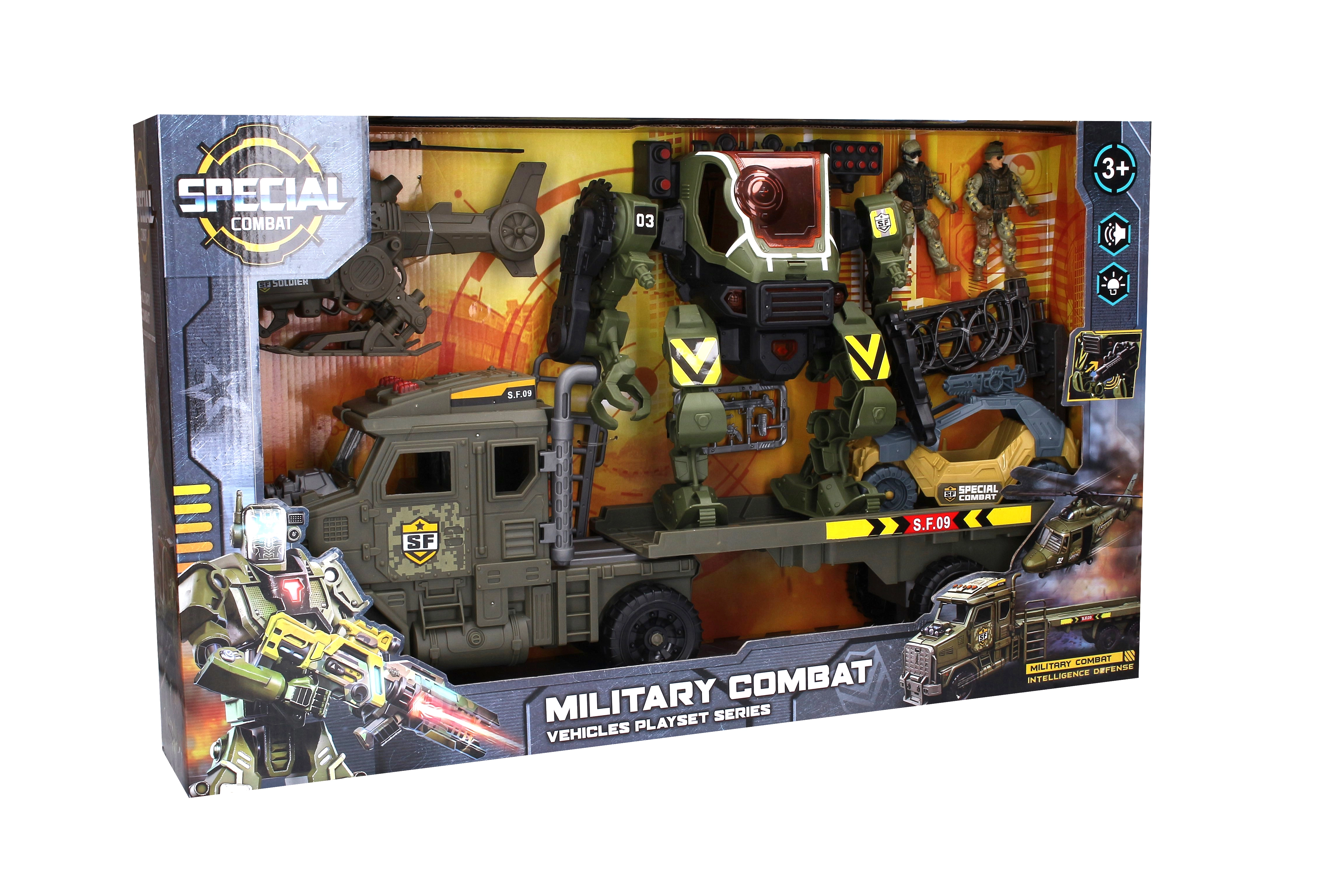 - Wojskowy ciągnik, robot mech z efektami, helikopter, buggy z karabinem maszynowym, 2× figurka pilota, umocnienia i wyposażenie dla żołnierzy