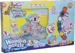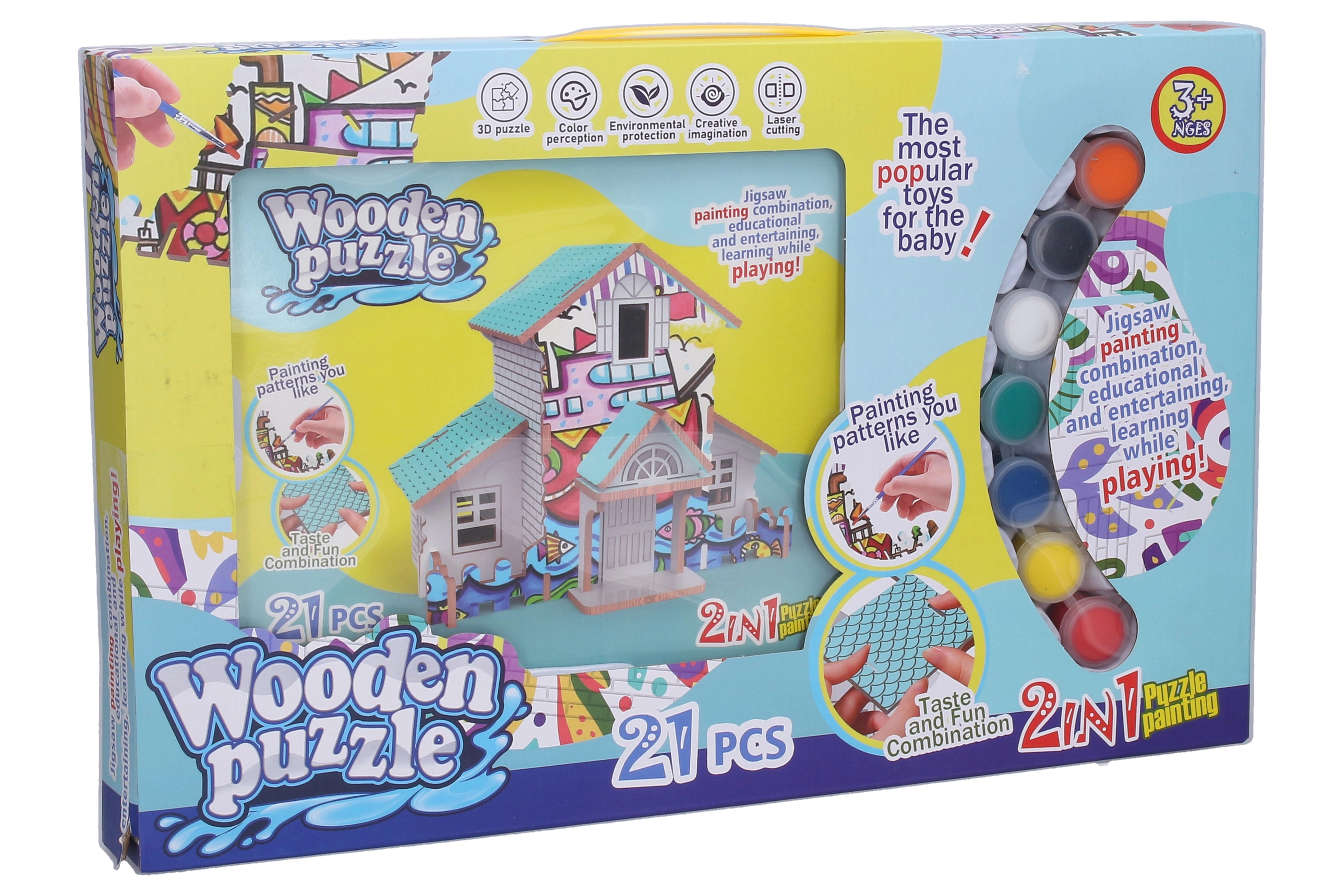 Odkryj kreatywną zabawę dla dzieci i dorosłych: 3D drewniane puzzle domku, które po złożeniu możesz samodzielnie pokolorować. Zestaw zawiera wszystko, czego potrzebujesz – precyzyjne drewniane elementy, farby, pędzelek oraz ilustrowaną instrukcję. Po złożeniu domek ma wymiary 13,2 × 9,1 × 10,5 cm.