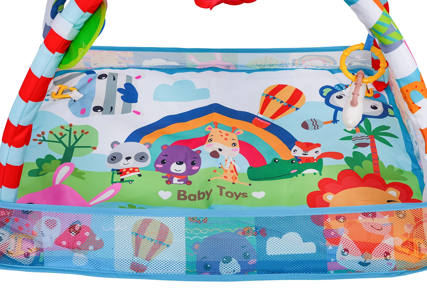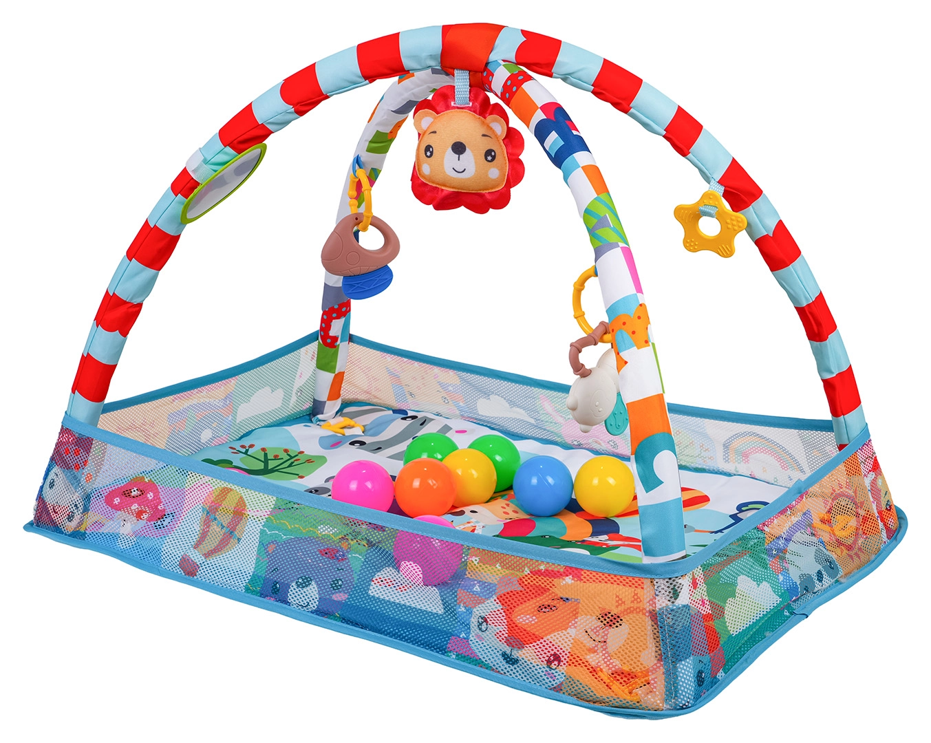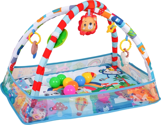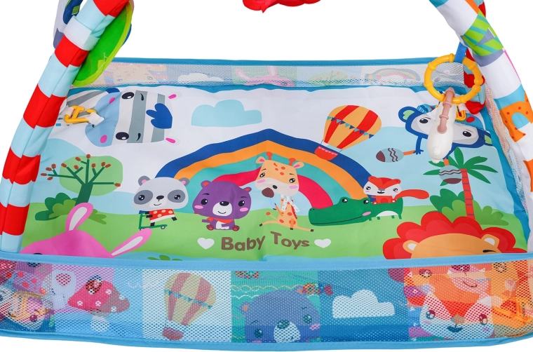 Odpinany pałąk z zawieszkami (bezpieczne lusterko, zabawki z grzechotkami i gryzakami, pluszowy lew z piszczałką itd.) zachęca dziecko do wyciągania rączek, chwytania i odkrywania. Mata wykonana jest z bezpiecznych, łatwych do czyszczenia materiałów, ma żywe kolory oraz stabilną konstrukcję do codziennej zabawy.