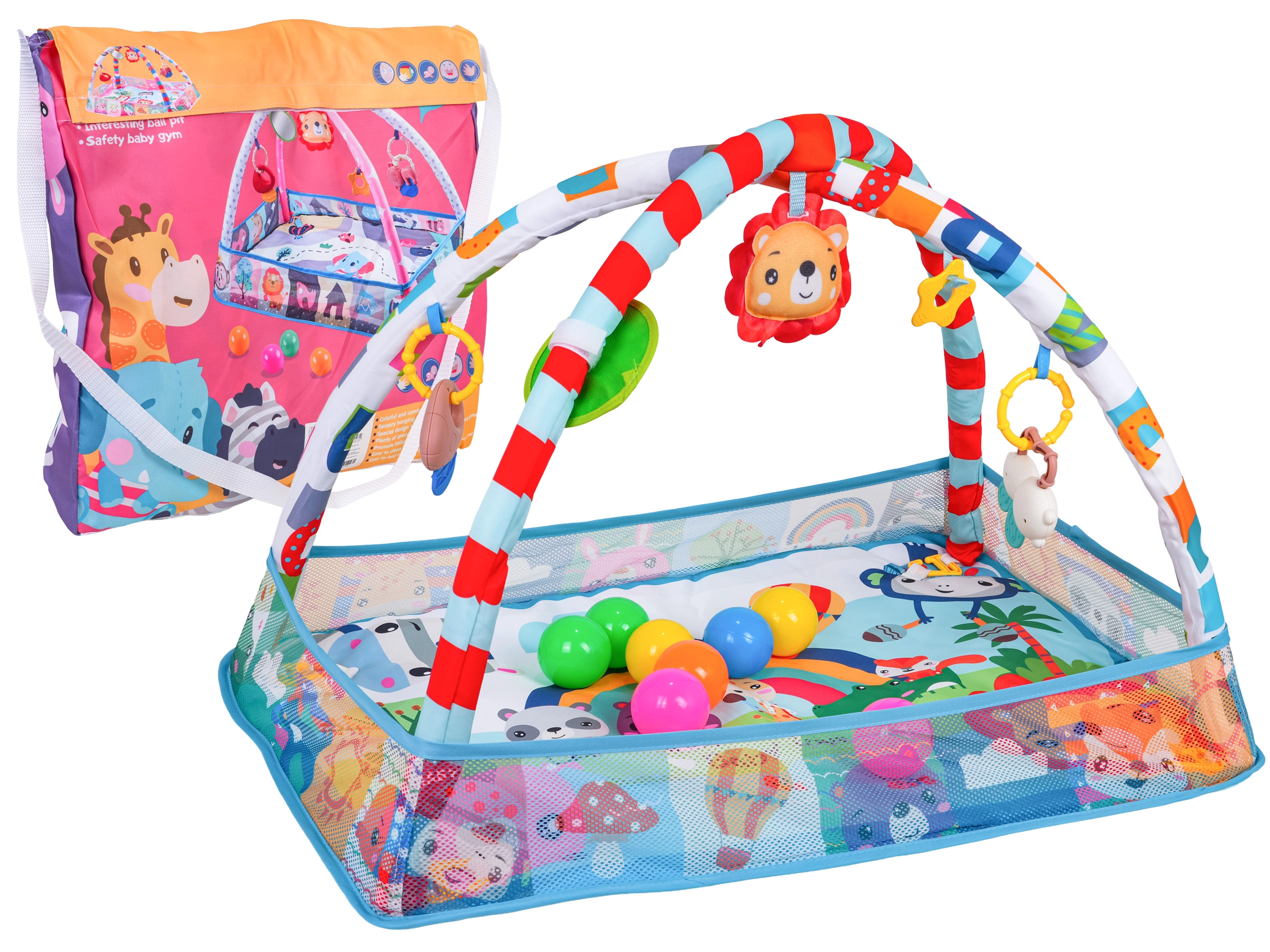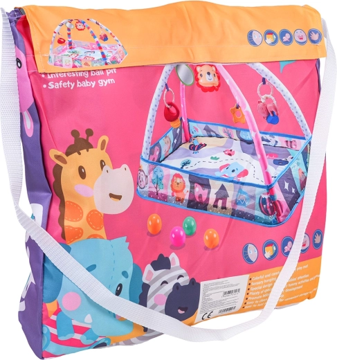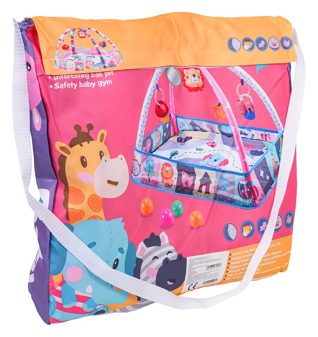 W zestawie: mata z zawieszkami, 8× plastikowa piłeczka do suchego baseniku oraz kolorowa torba na ramię do łatwego przenoszenia i przechowywania.