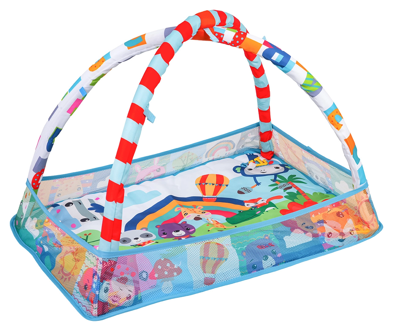 Ta kolorowa mata tworzy bezpieczne i stymulujące środowisko do rozwoju zmysłów i motoryki już od pierwszych dni. Dzięki siatkowym bokom utrzymuje zabawki i piłeczki w środku, zapewniając maluszkowi spokojną przestrzeń do leżenia na plecach oraz do czasu na brzuszku (tummy time).