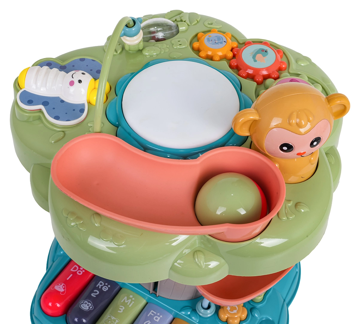 Nie brakuje koralikowego labiryntu, kół zębatych, wyjmowanych grzechotek oraz zwierzątek na sznureczku do dopasowywania kształtów. Dzieci mogą naciskać przyciski, kręcić, przemieszczać i bębnić – każda akcja wywołuje dźwięk lub światło. Zabawka wykonana jest z trwałego plastiku bez ostrych krawędzi i zaprojektowana do bezpiecznej domowej zabawy.
