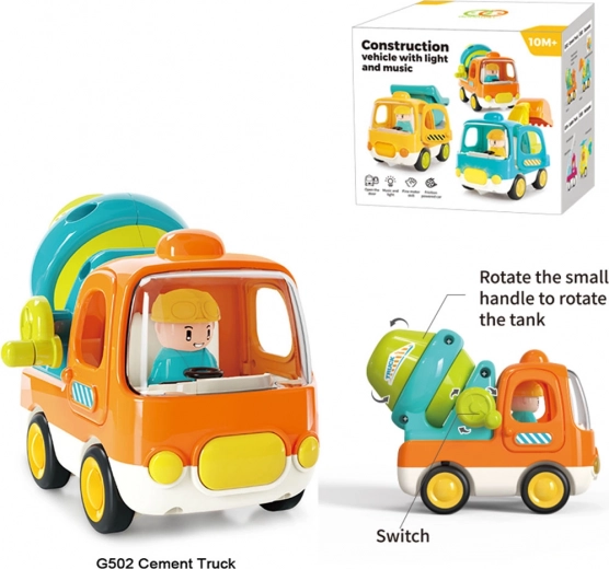 Pojazd ma otwierane boczne drzwi i obrotowy bęben na korbkę, które zachęcają do odkrywania i rozwijają małą motorykę. Wesołe melodie, dźwięk uruchamiania i klakson ucieszą każde dziecko i pobudzą do kreatywnej zabawy.