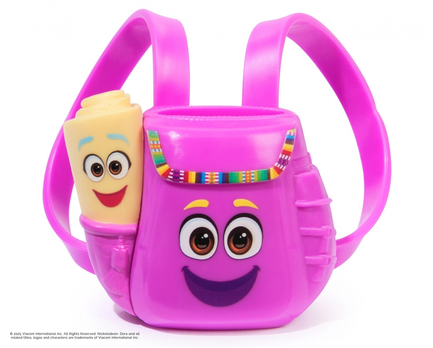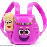W zestawie jest ikoniczny fioletowy plecaczek z uśmiechniętą buzią – po naciśnięciu otwiera się górna część, gotowa na małe skarby z wypraw. Lalka została zaprojektowana z myślą o zabawie wyobrażeniowej, wspiera małą motorykę i naturalną naukę słówek.