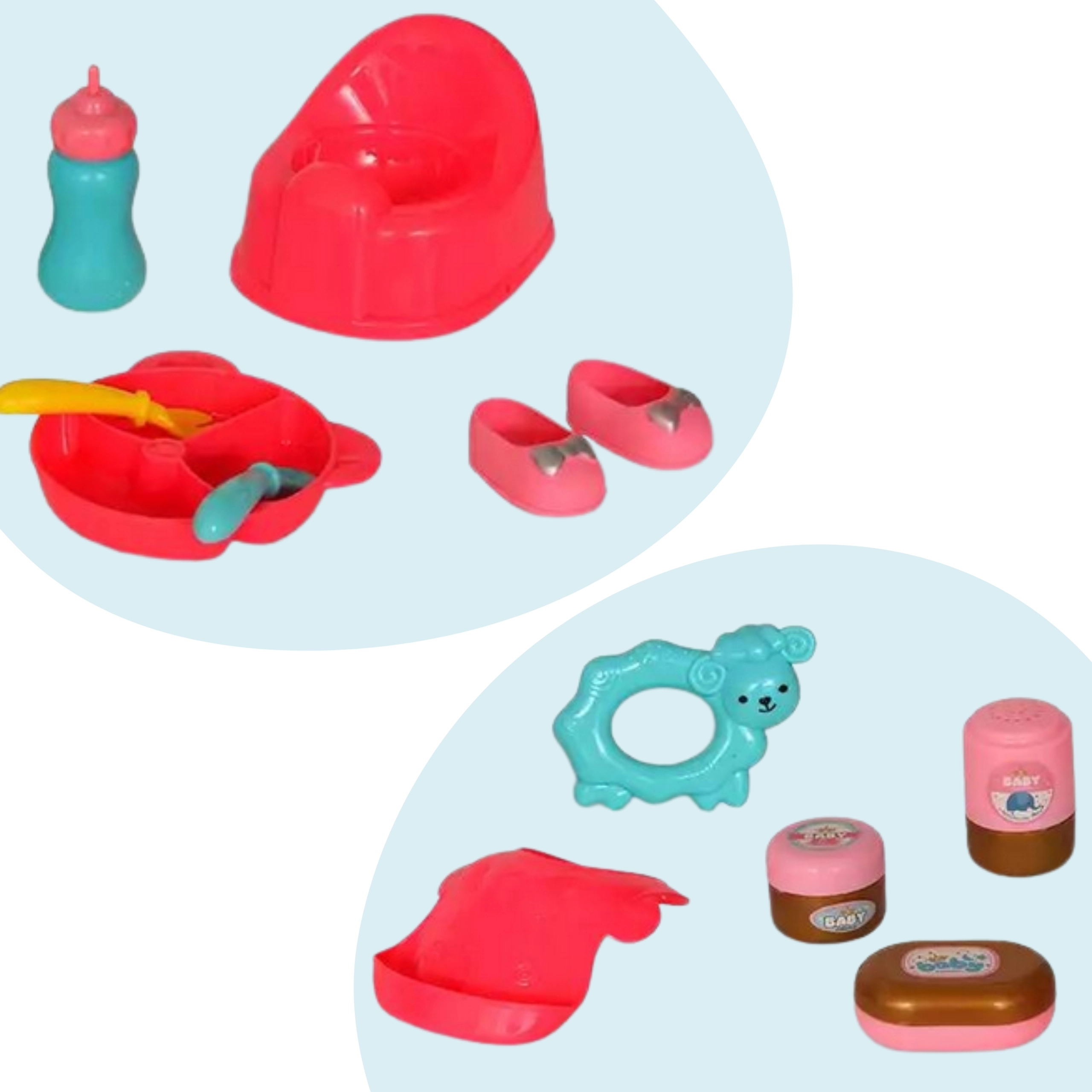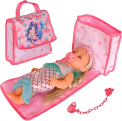 Lalka syrena, wózek-parasolka, łóżeczko/kojec podróżny, mata do zabawy z pałąkiem, torby, nocnik, akcesoria do karmienia i pielęgnacji