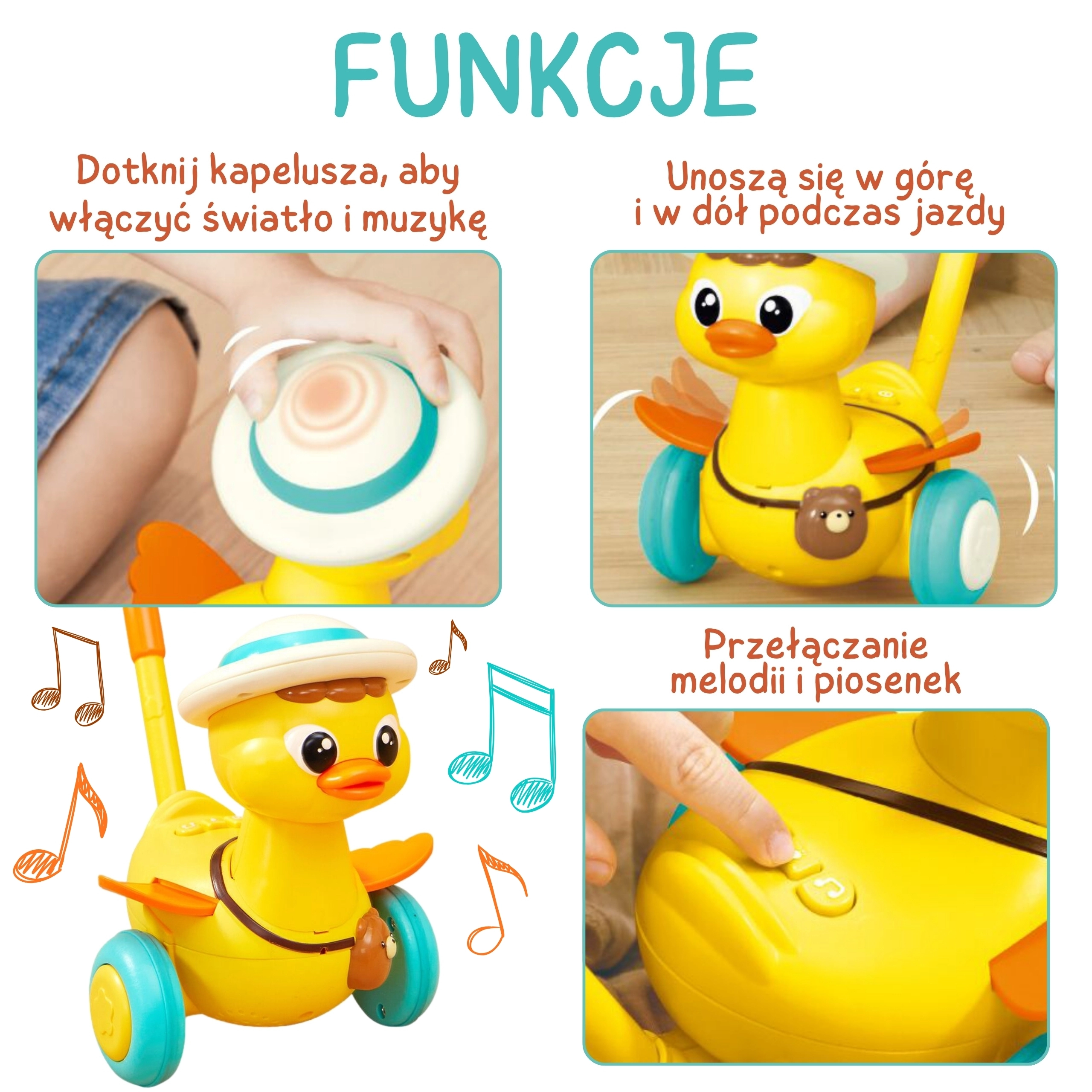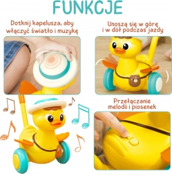 - Napęd zabawy: podskakujące kółka wprawiają kaczuszkę w ruch podczas chodzenia