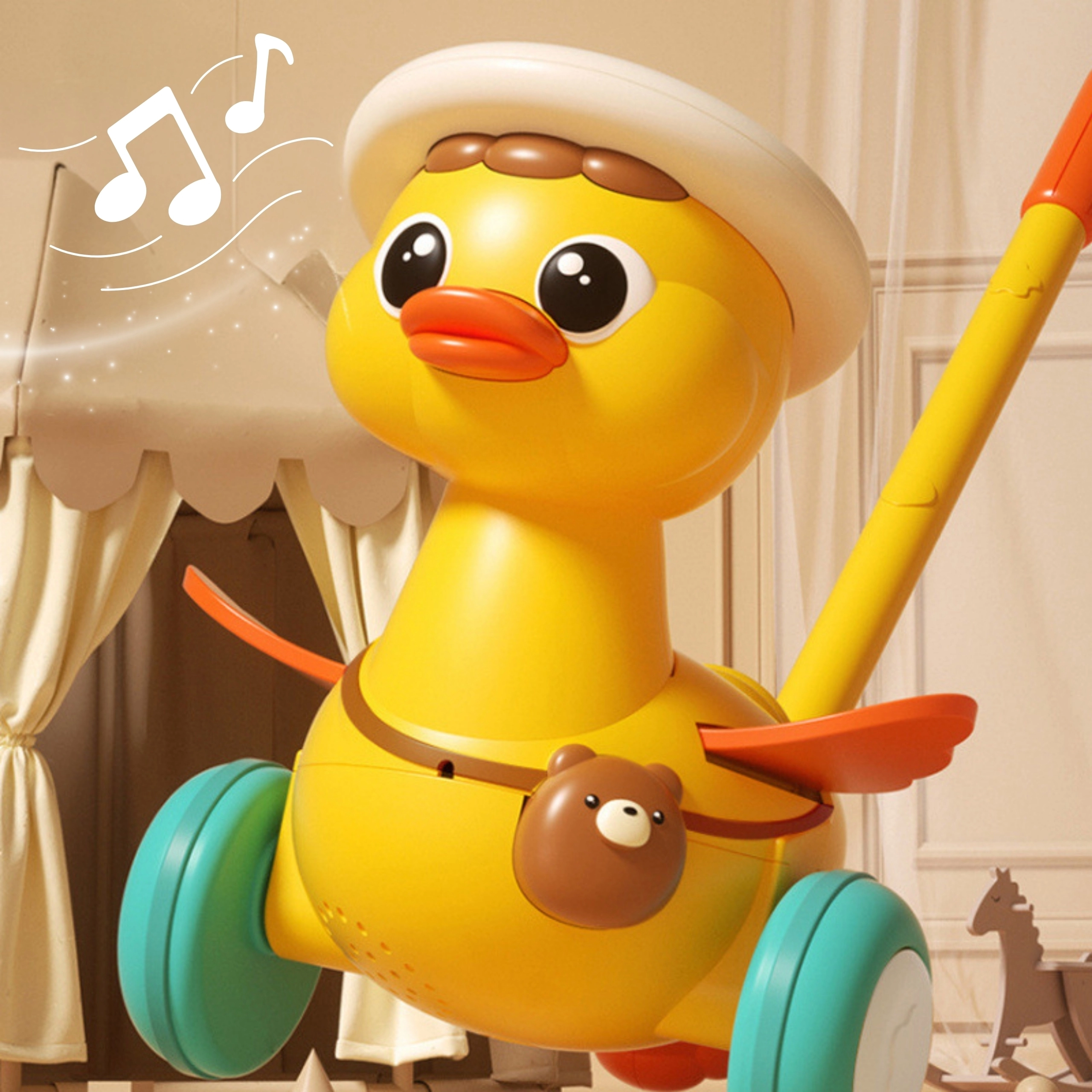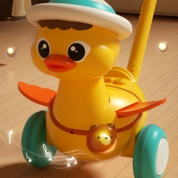 Urocza kaczuszka na kiju marki WOOPIE zamieni pierwsze kroki w świetną zabawę. Podczas jazdy macha skrzydełkami, świeci i odtwarza wesołe melodie. Dzięki lekkiej konstrukcji, stabilnym szerokim kółkom i łatwej obsłudze przyciskami dzieci pokochają ją od razu. Świetny towarzysz rozwoju motoryki i samodzielności już od 18 miesięcy.