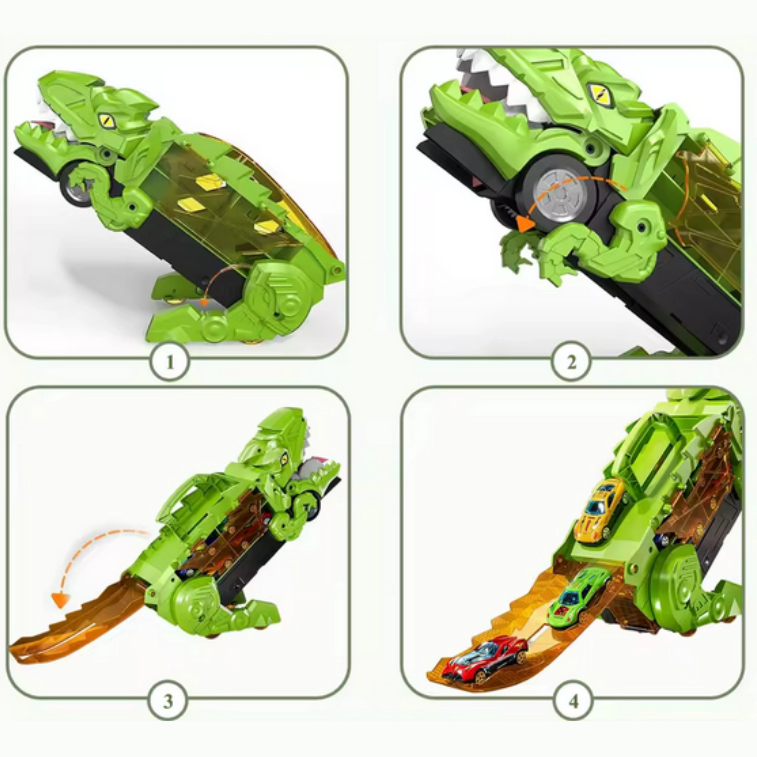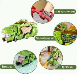 Odkryj świat dinozaurów i wyścigowych aut w jednym! Ten dino-ciężarówka z rampą od WOOPIE służy jako przenośna walizka z uchwytem, schowek oraz tor wyścigowy. W środku znajdziesz 12 metalowych autek, które możesz zjeżdżać po składanej rampie zjazdowej. Otwierana paszcza, ruchome elementy i trwałe, bezpieczne materiały zapewnią godziny twórczej zabawy w domu i w podróży.