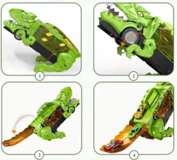 Otwórz głowę dinozaura i rozłóż pomarańczową zjeżdżalnię. Auta płynnie wyjadą na zewnątrz i wyścig może się rozpocząć.