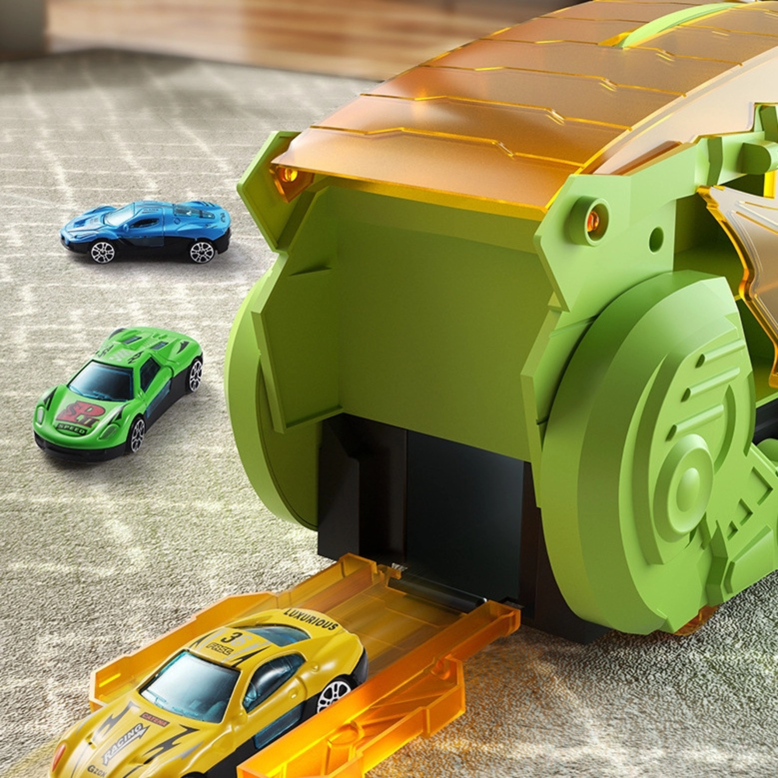Zintegrowane przegródki utrzymają wszystkie pojazdy w porządku. Złóż ścianki, zamknij paszczę i zabierz zestaw dzięki uchwytowi gdziekolwiek chcesz.