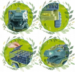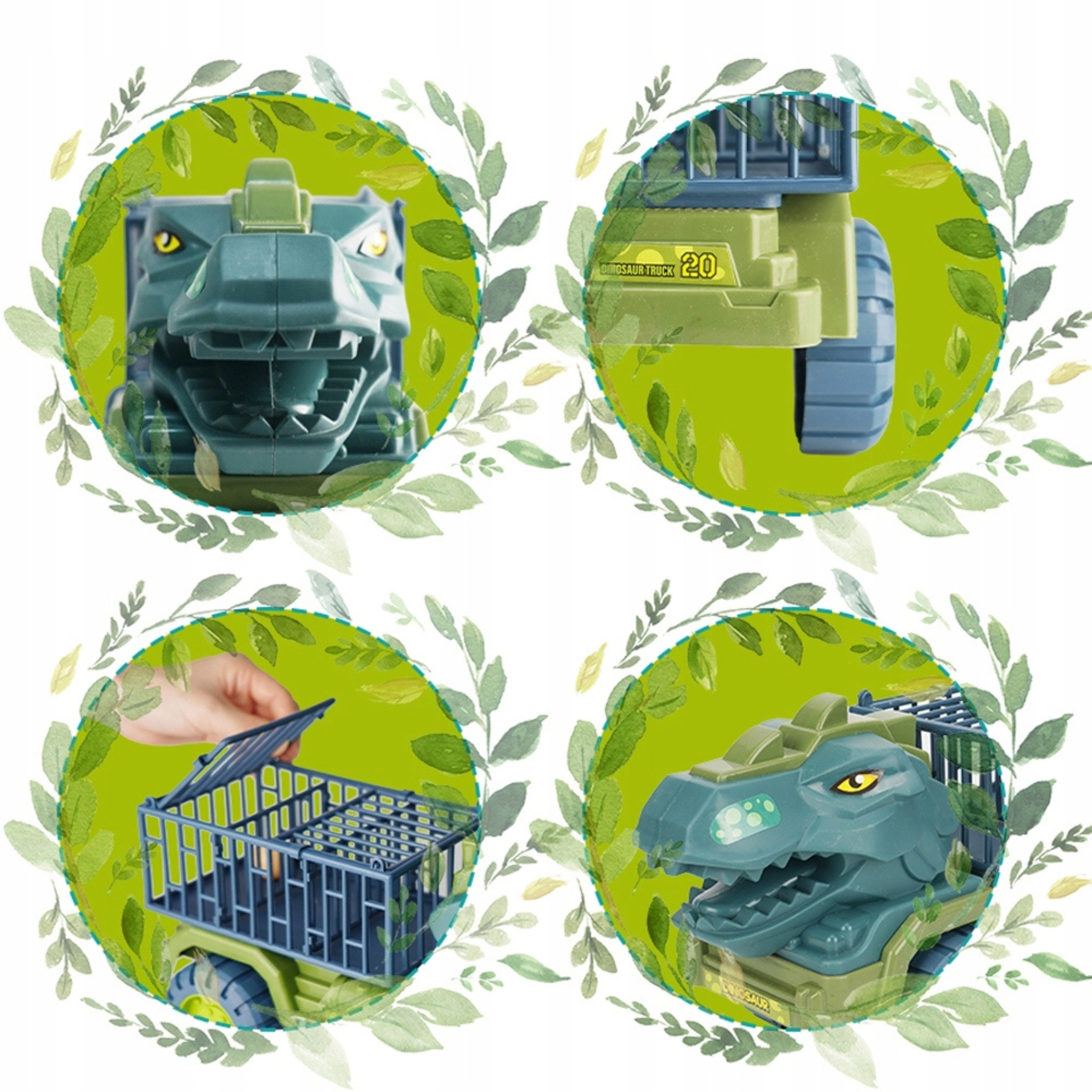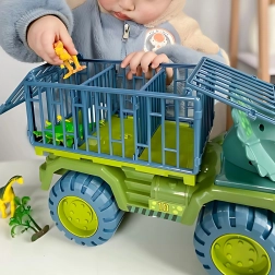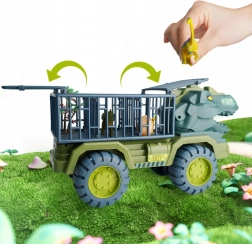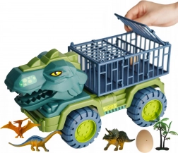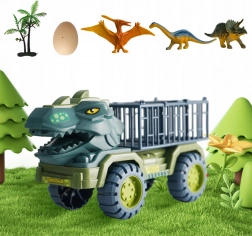 Opakowanie zawiera: transporter dinozaurów, 15 figurek dinozaurów, jajko dinozaura, dekoracje (drzewko, kamienie).