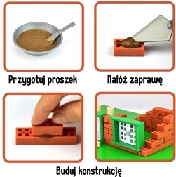 Obsługa jest prosta: wymieszaj proszek z wodą 1:1, nałóż zaprawę szpatułką i układaj cegły warstwa po warstwie. Gotowy dom można do ponownego użycia zanurzyć w ciepłej wodzie na 1–3 godziny – zaprawa się rozpuści, a elementy można wykorzystać ponownie. Dziecięce narzędzia w zestawie uczą prawidłowych ruchów i rozwijają małą motorykę.