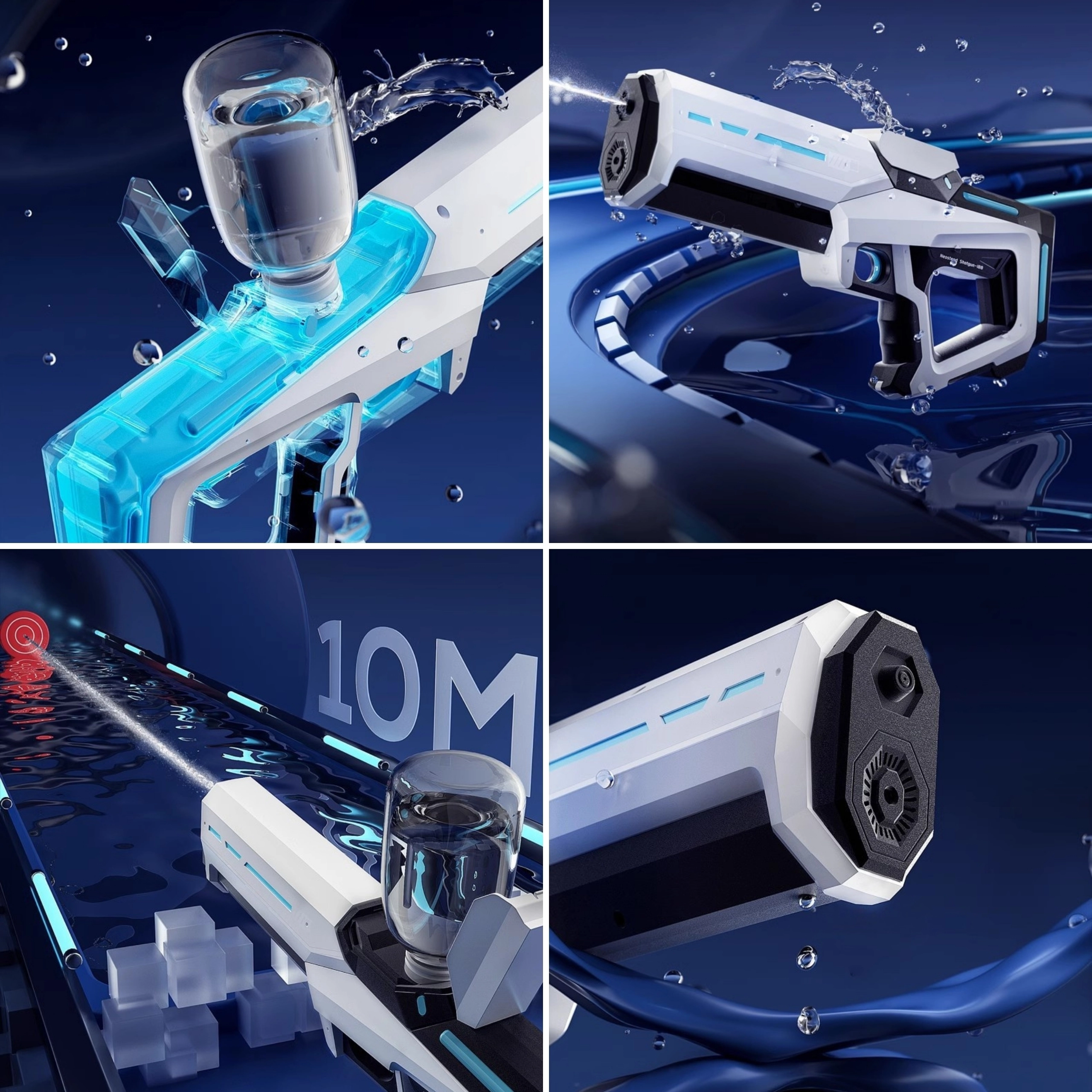 - Długi zasięg strzału w porównaniu z typowymi pistoletami na wodę