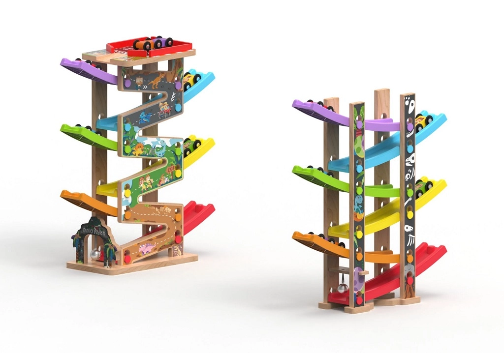 Samochodziki startują z górnej platformy i mkną w dół po sześciostopniowym torze. Dzieci obserwują płynny ruch i uczą się zasad grawitacji oraz przyczyny i skutku.
