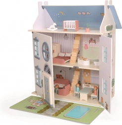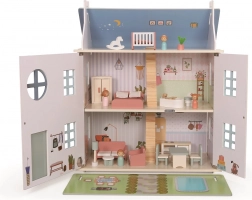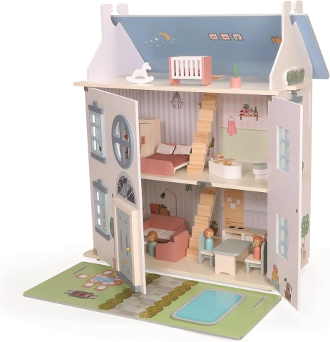 Ten ponadczasowy drewniany domek dla lalek został zaprojektowany do twórczej zabawy dla dzieci od 3. roku życia. Oferuje trzy piętra z przestronnymi pomieszczeniami – nowoczesną kuchnię, łazienkę, przytulną sypialnię, salon oraz pokój dziecięcy na poddaszu. Przednią część dachu można zdjąć, odwrócić i położyć przed domkiem, tworząc ogród z basenem i miejscem do siedzenia.