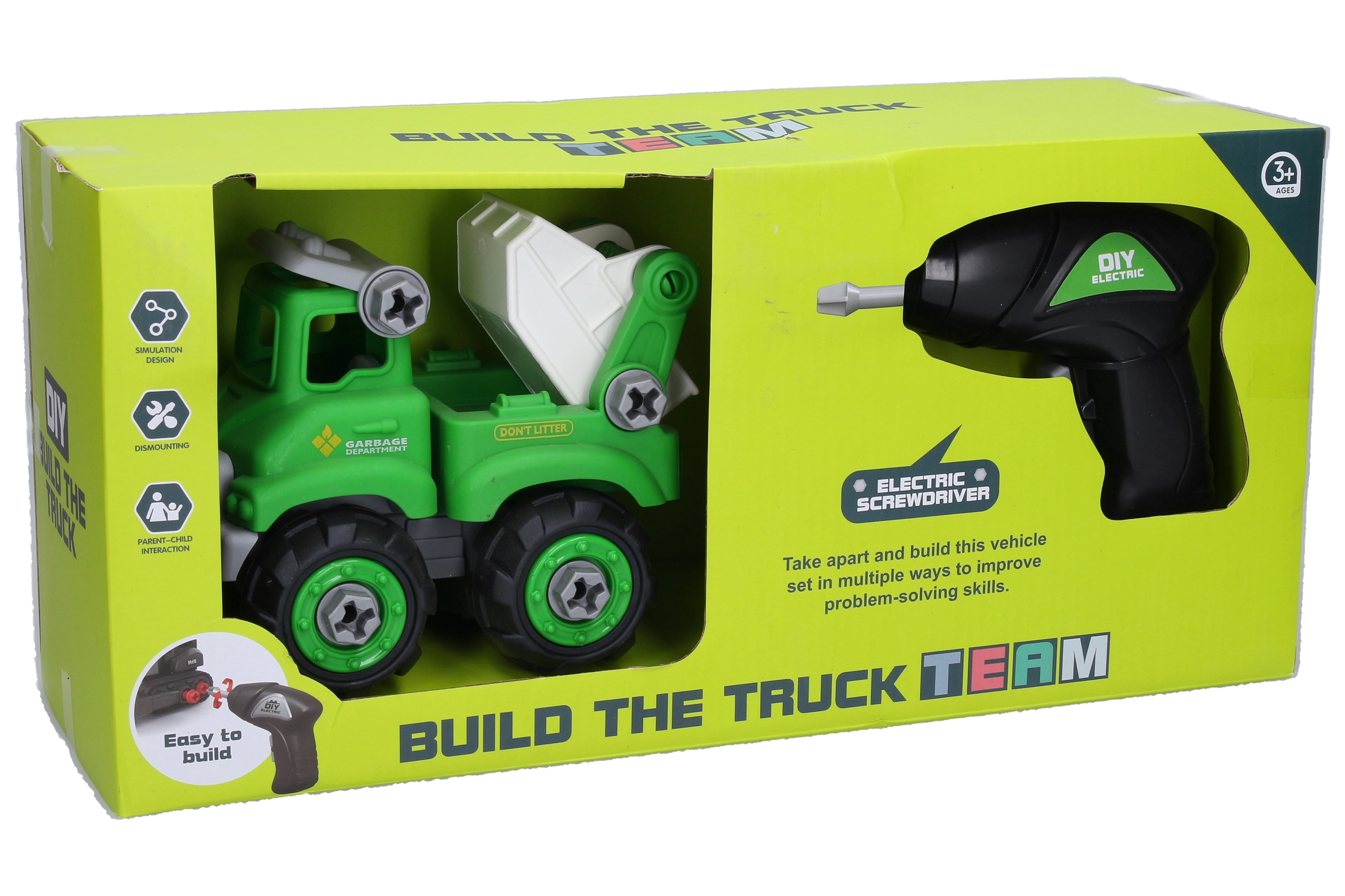 Zabawna zestaw konstrukcyjny dla małych techników: śrubowana śmieciarka o długości 17 cm z elektrycznym wkrętakiem i narzędziami manualnymi. Dzieci samodzielnie rozkładają i składają pojazd, rozwijając małą motorykę, logiczne myślenie oraz cierpliwość. Elektryczny wkrętak działa na 2× baterie AA (brak w zestawie).