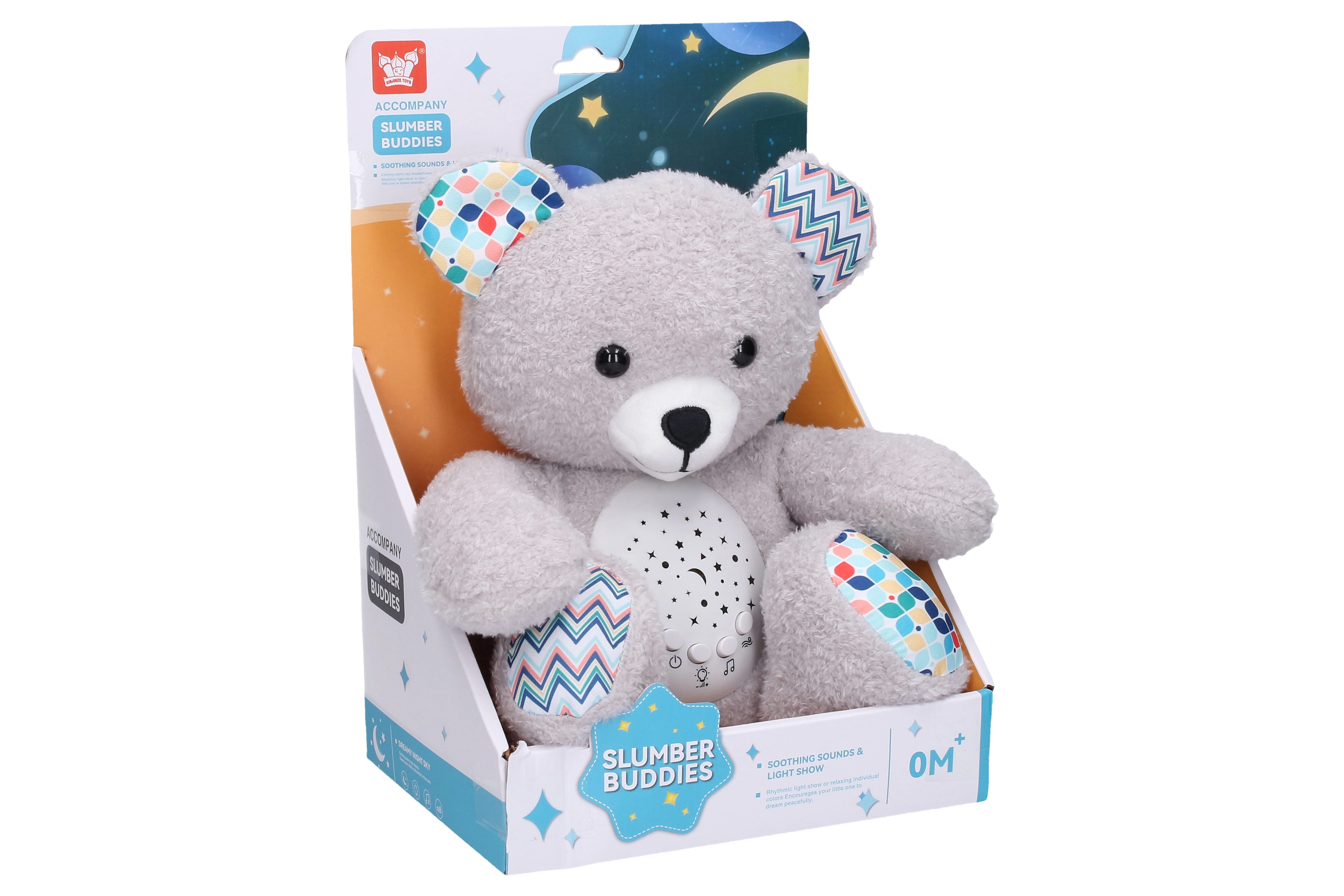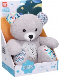 Urocza przytulanka w kształcie misia z wyjmowanym projektorem pomaga dzieciom spokojnie zasypiać. Oferuje projekcję ze stopniowaną intensywnością, 7 kołysanek oraz 3 rodzaje białego szumu z automatycznym wyłączeniem po 30 minutach. Sterowanie jest proste za pomocą przycisków ON/OFF, światła, nuty i fali.