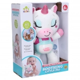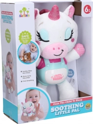 Urocza przytulanka–usypiacz w kształcie jednorożca pomaga dzieciom spokojnie zasypiać dzięki połączeniu kołysanek, uspokajającej muzyki, dźwięków chrapania oraz delikatnego efektu świetlnego. Obsługa jest prosta – wystarczy nacisnąć brzuszek i wybrać tryb. Praktyczny przełącznik on/off znajduje się z boku zabawki. Wysokość 29 cm, zasilanie 3× baterie AAA (brak w zestawie).