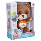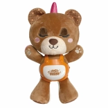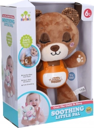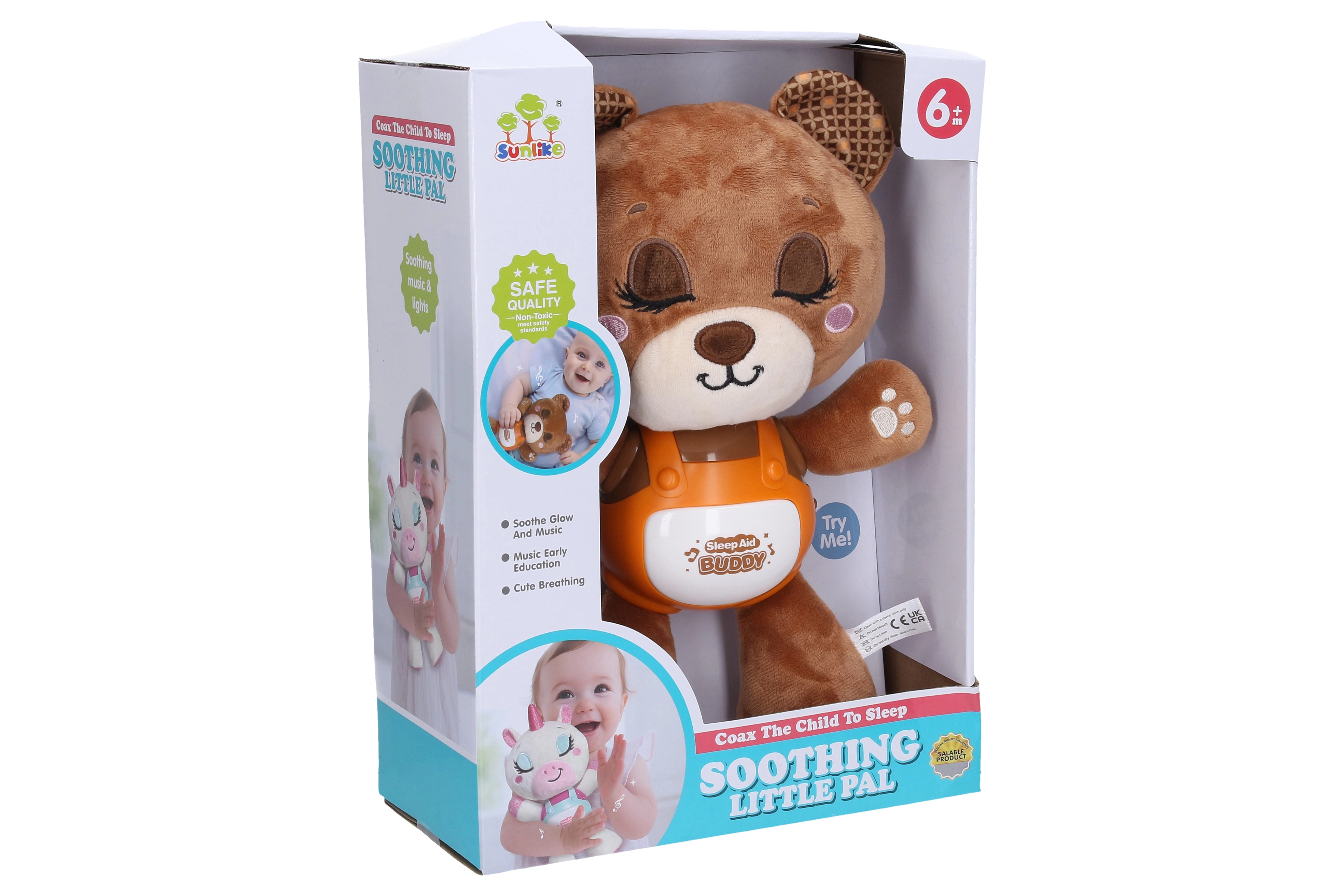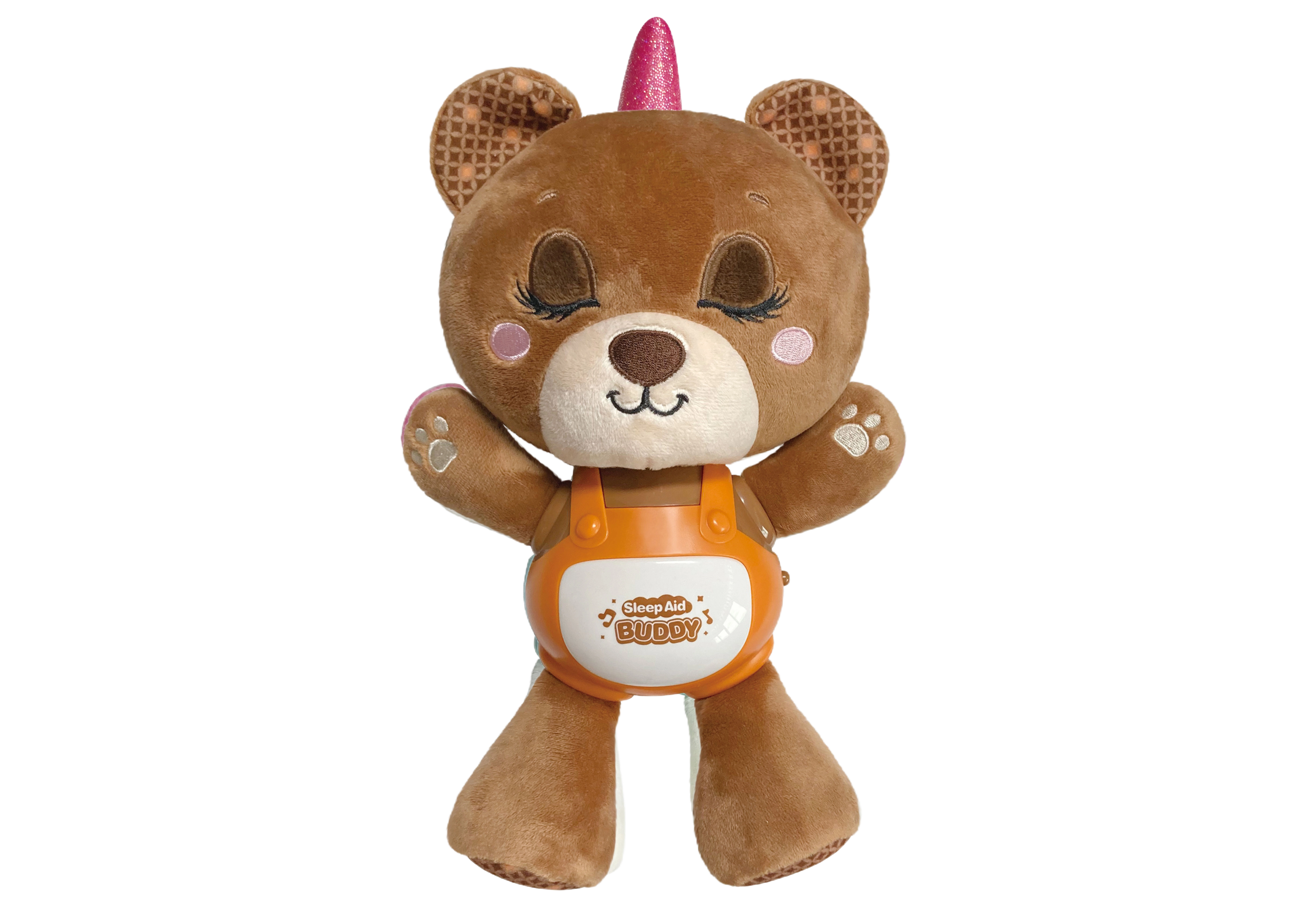 Uroczy usypiacz w kształcie misia o wysokości 29 cm pomaga dzieciom spokojnie zasnąć dzięki połączeniu kołysanek, uspokajającej muzyki, dźwięku chrapania oraz delikatnego nocnego światełka. Obsługa jest prosta – wystarczy nacisnąć brzuszek i przełączać się między trybami. Praktyczny przełącznik on/off znajduje się z boku.