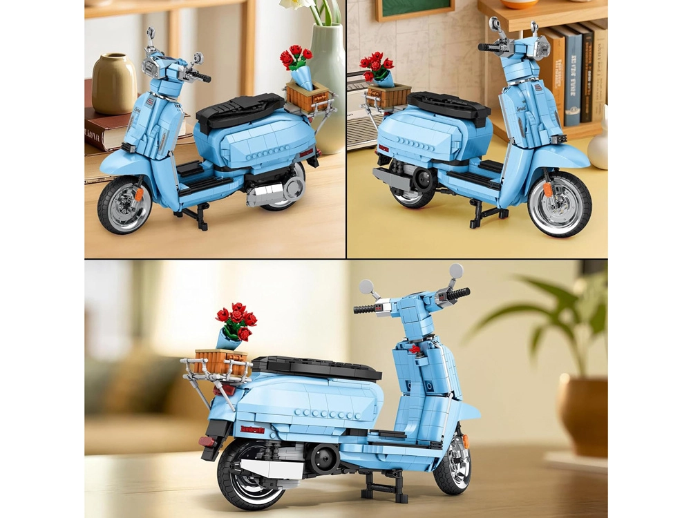 Zestaw jest przemyślanie podzielony na woreczki i uzupełniony naklejkami z detalami, dzięki czemu budowa jest przejrzysta i angażująca. Po ukończeniu modelu docenisz solidną konstrukcję, funkcjonalną podpórkę oraz autentyczne proporcje legendarnego skutera.