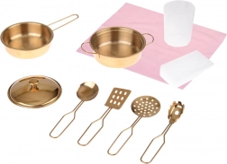 W zestawie znajdują się naczynia i dodatki, więc zabawa może zacząć się od razu: metalowy garnek i rondel z pokrywką, chochelka, łyżka cedzakowa, łopatka, szczypce do makaronu, plastikowy kubek, gąbka i różowa ściereczka. Dolne szafki i półki oferują dużo miejsca do przechowywania żywności i akcesoriów.